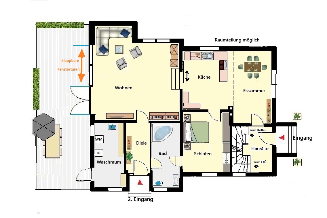 Ansicht Immobilie mit TerrasseEingang an der VorderseiteHausansichtca. 415 m² Baugrundsück heller, großer Wohnraum EGoffene Wohn-Küche EGSchlafzimmer EGmodernes BadezimmerBadezimmer mit Fenster im EGgroßzügiger GartenbereichEingangsdiele EGZweiter Eingang großer Wohnraum mit Loggia OGSchlafzimmer OGBadezimmer im OGWasch- und TrockenraumHolzhaus im Gartenbreiter Einfahrtswegca. 415 m² Bauland auf dem Flurstückgroßes Grundstück ca. 1631 m²Grundriss ErdgeschossGrundriss ObergeschossGrundriss Teilkeller Wir beraten Sie gerne!ca. 35 m² Wohnraum EG