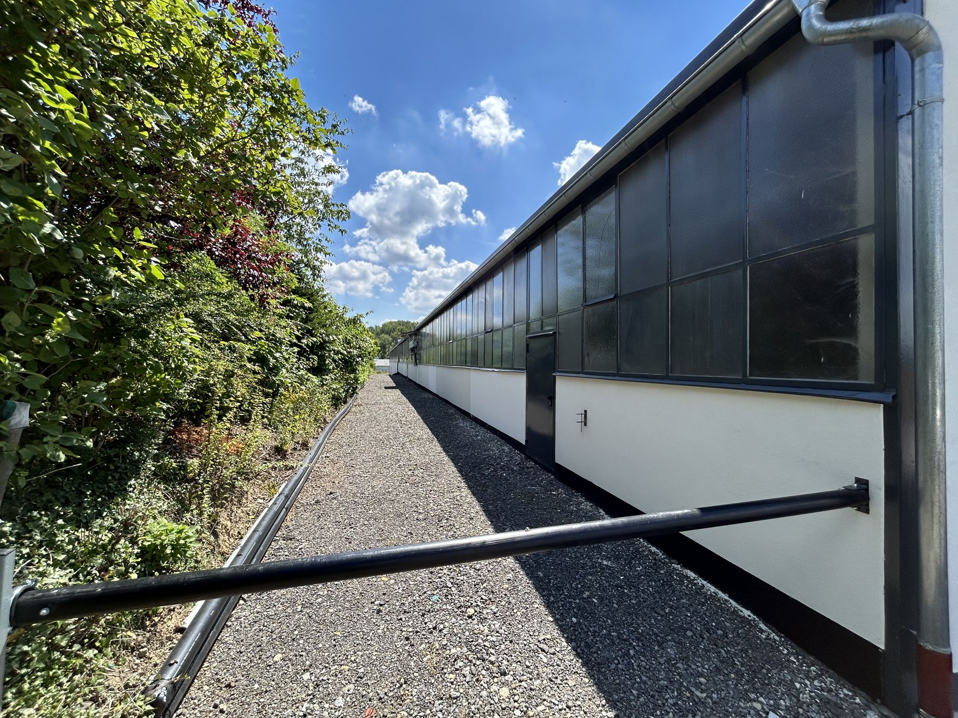 Zur Vermietung stehen hier der zwei Hallenbereiche einer Doppelhalle. Diese wurden 2022 umfassend modernisiert (neues Sandwichdach mit Lichtkuppeln, neue Rolltore, neue Brennwertgasheizung (>90 kW), ...) und mit einer Sprinter-tauglichen Hallenumfahrt versehen, über die man das Rolltor zur hinteren Halle (ca. 1.100 m², 4,50 - 6 m Innenhöhe) erreichen kann.