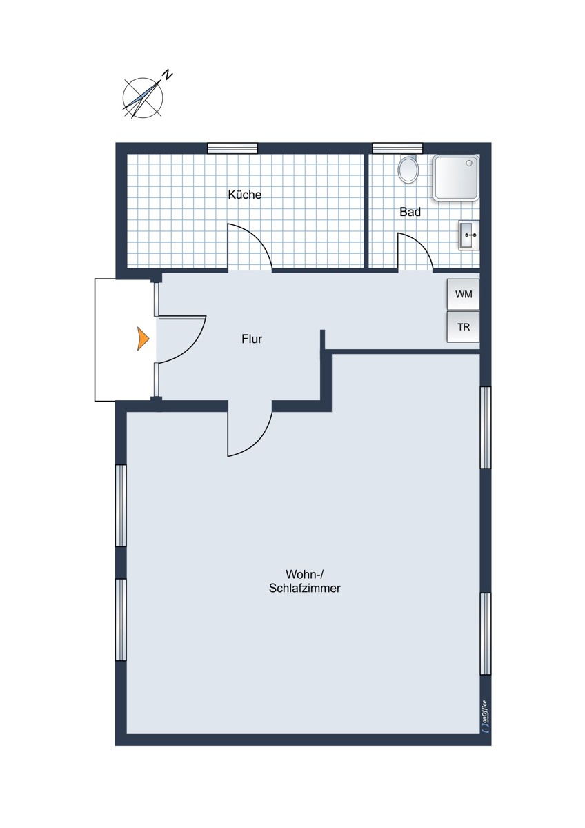 - Windfang/Flur mit Anschluss für eine Waschmaschine und/oder Trockner - Großzügiger und gut teilbarer Wohn- und Schlafraum - Küchenzeile mit Einbauten und Platz für eine Sitzecke - Duschbad mit Fenster
