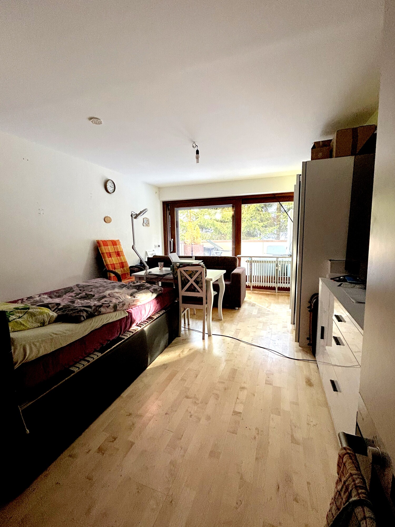 Beim Eintreten gelangen Sie in den Flur, der Platz für Garderobe und Stauraum bietet. Von hier aus sind die Bereiche der Wohnung gut erreichbar. Der Wohn und Schlafraum ist angenehm geschnitten und lässt sich mit wenigen Handgriffen in Zonen gliedern, etwa für Schlafen, Arbeiten und Wohnen. Große Fensterflächen sorgen für gutes Tageslicht.