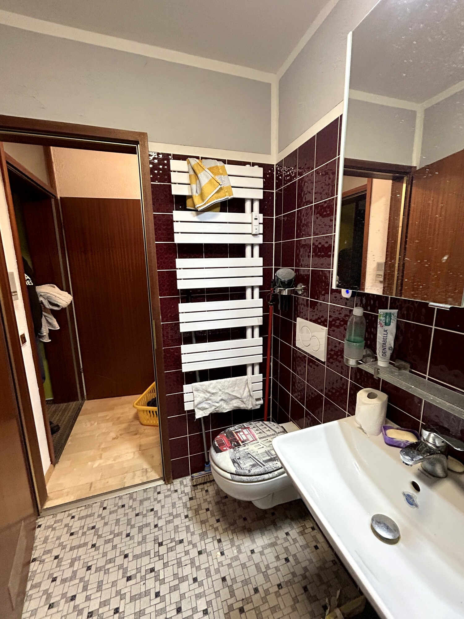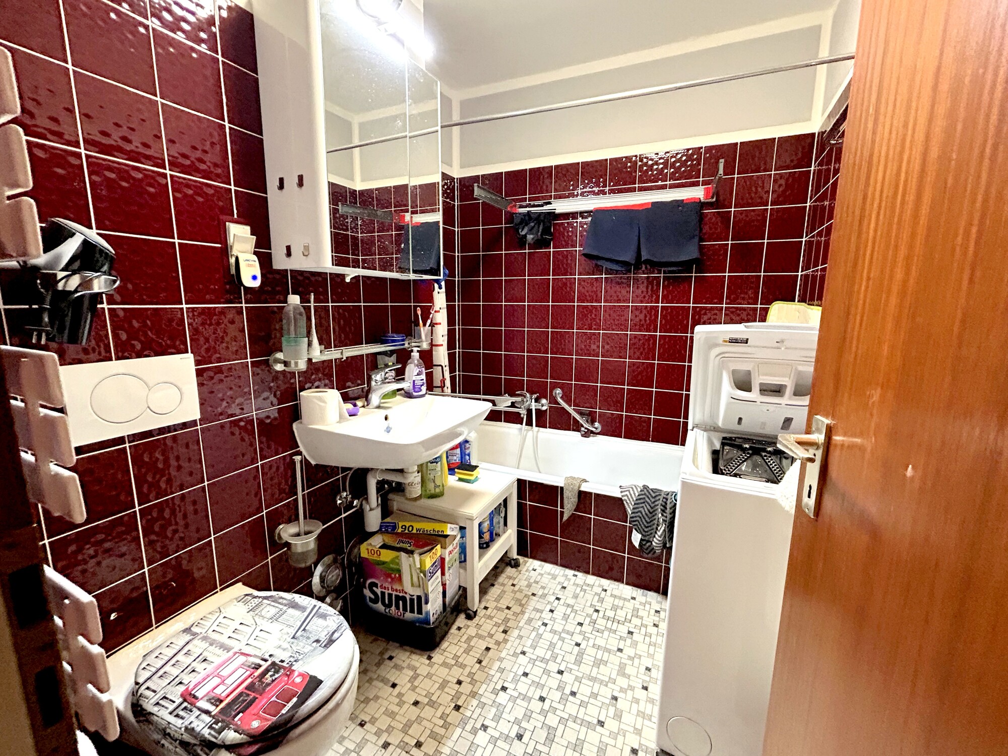 Das Badezimmer ist mit Badewanne ausgestattet und bietet zusätzlich einen Handtuchheizkörper. Praktisch ist die Möglichkeit, eine Waschmaschine im Bad unterzubringen.