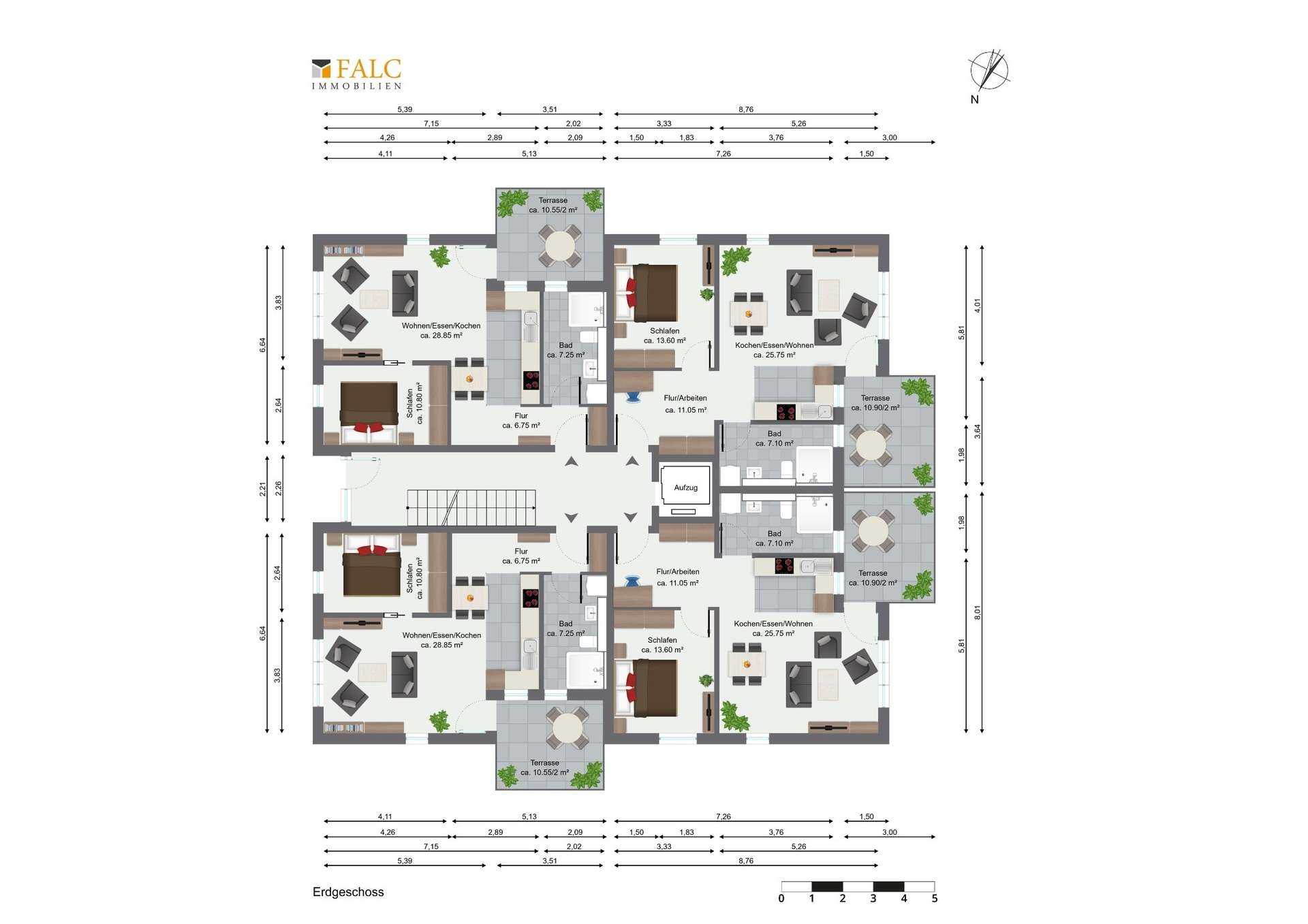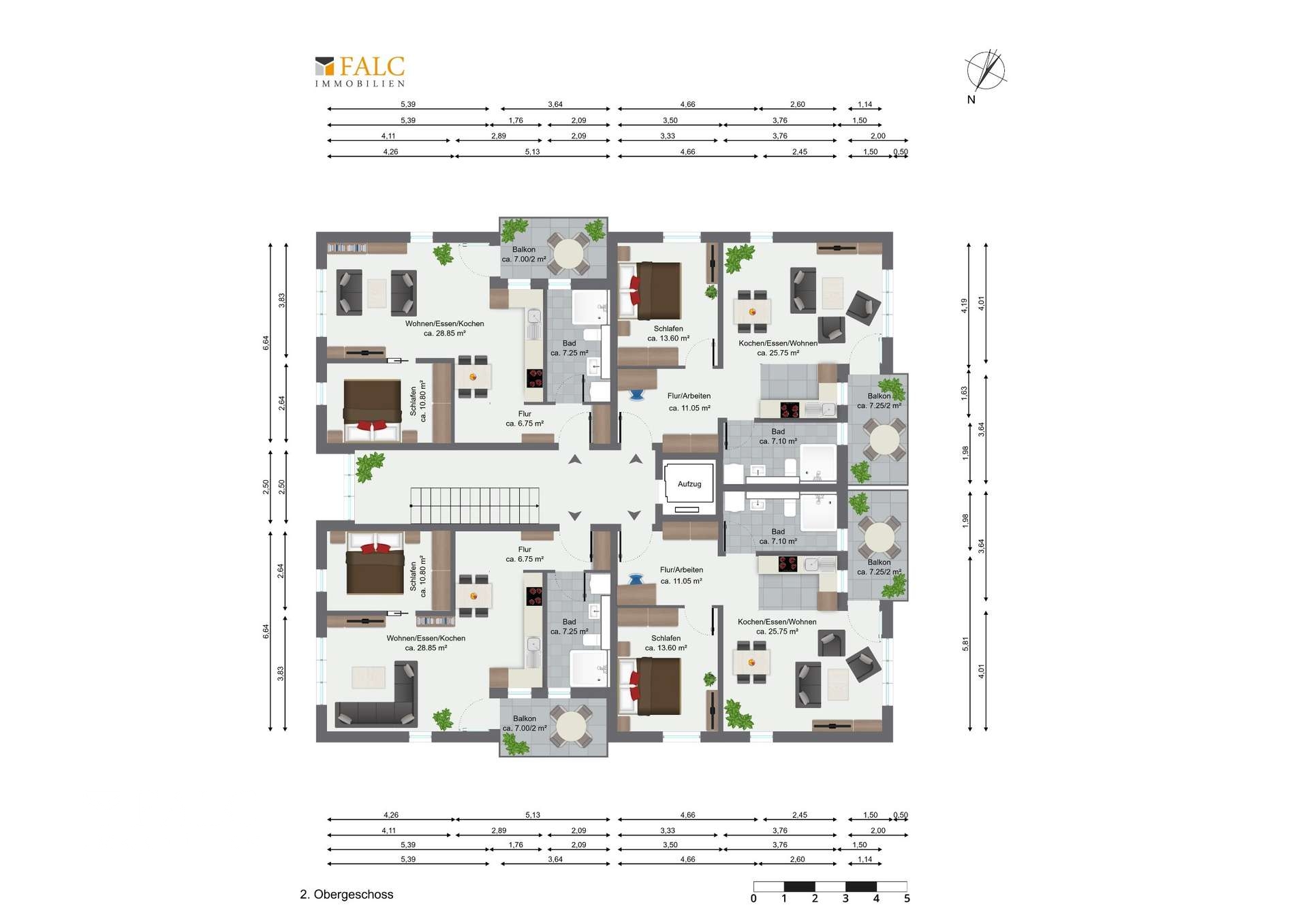 Alle zwölf Wohneinheiten sind aktuell langfristig vermietet und bieten ein hohes Maß an Wohnkomfort. Es handelt sich ausschließlich um durchdacht geschnittene Zwei-Zimmer-Wohnungen mit Wohnflächen zwischen ca. 57,15 m² und 61,13 m². Die Wohnungen im Erdgeschoss verfügen jeweils über eine eigene Terrasse mit Blick ins Grüne, während alle darüber liegenden Einheiten mit einem großzügigen Balkon ausgestattet sind. Sämtliche Wohnungen zeichnen sich durch eine offene, lichtdurchflutete Gestaltung aus. Große, bodentiefe Fensterfronten im Wohnzimmer sorgen für ein angenehmes Raumgefühl und schaffen helle Wohnatmosphäre. Hochwertiges Echtholzparkett verleiht allen Räumen einen eleganten Charakter.