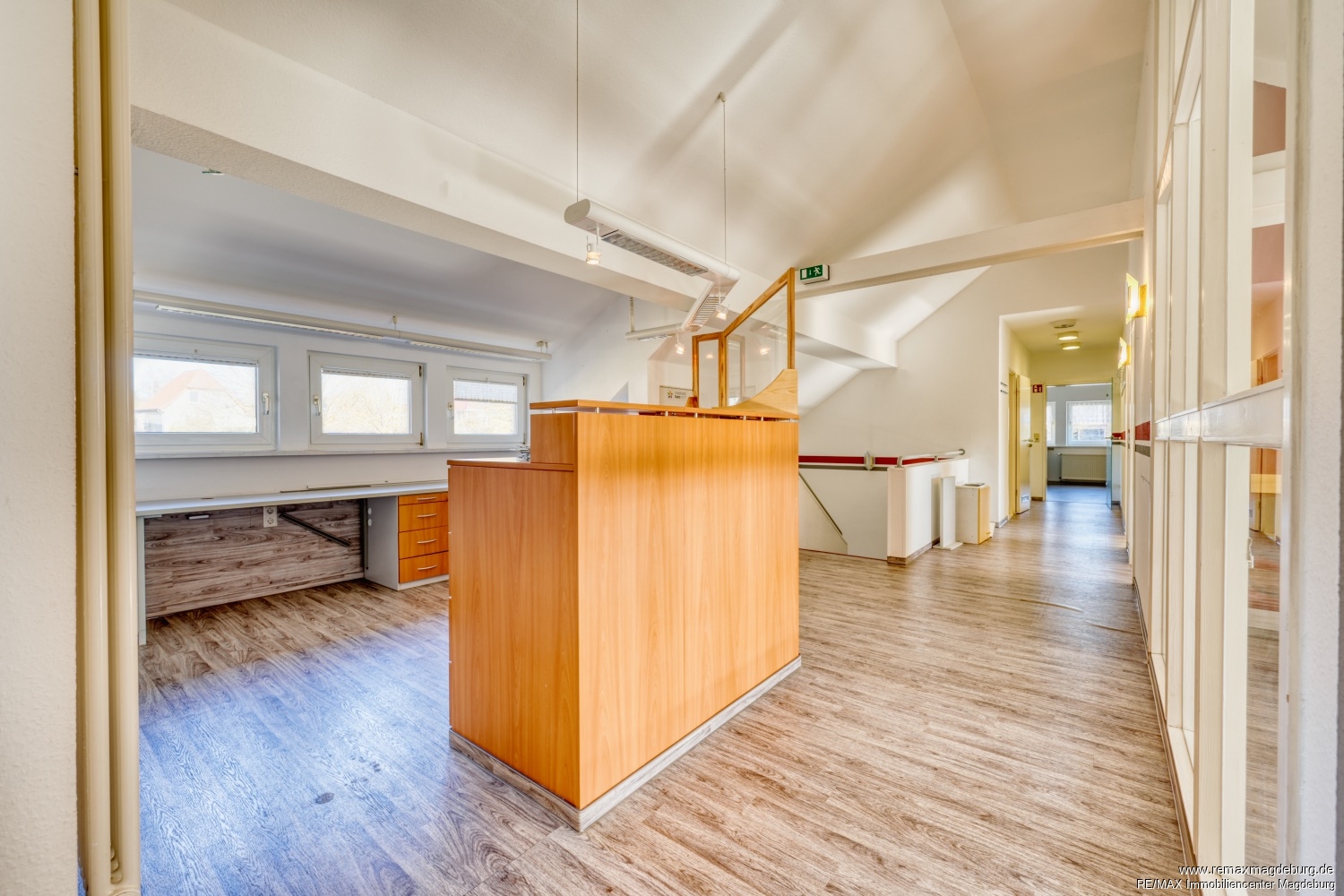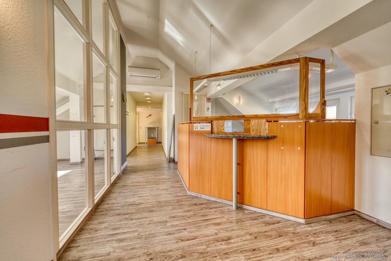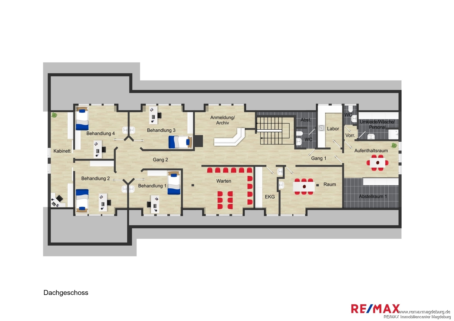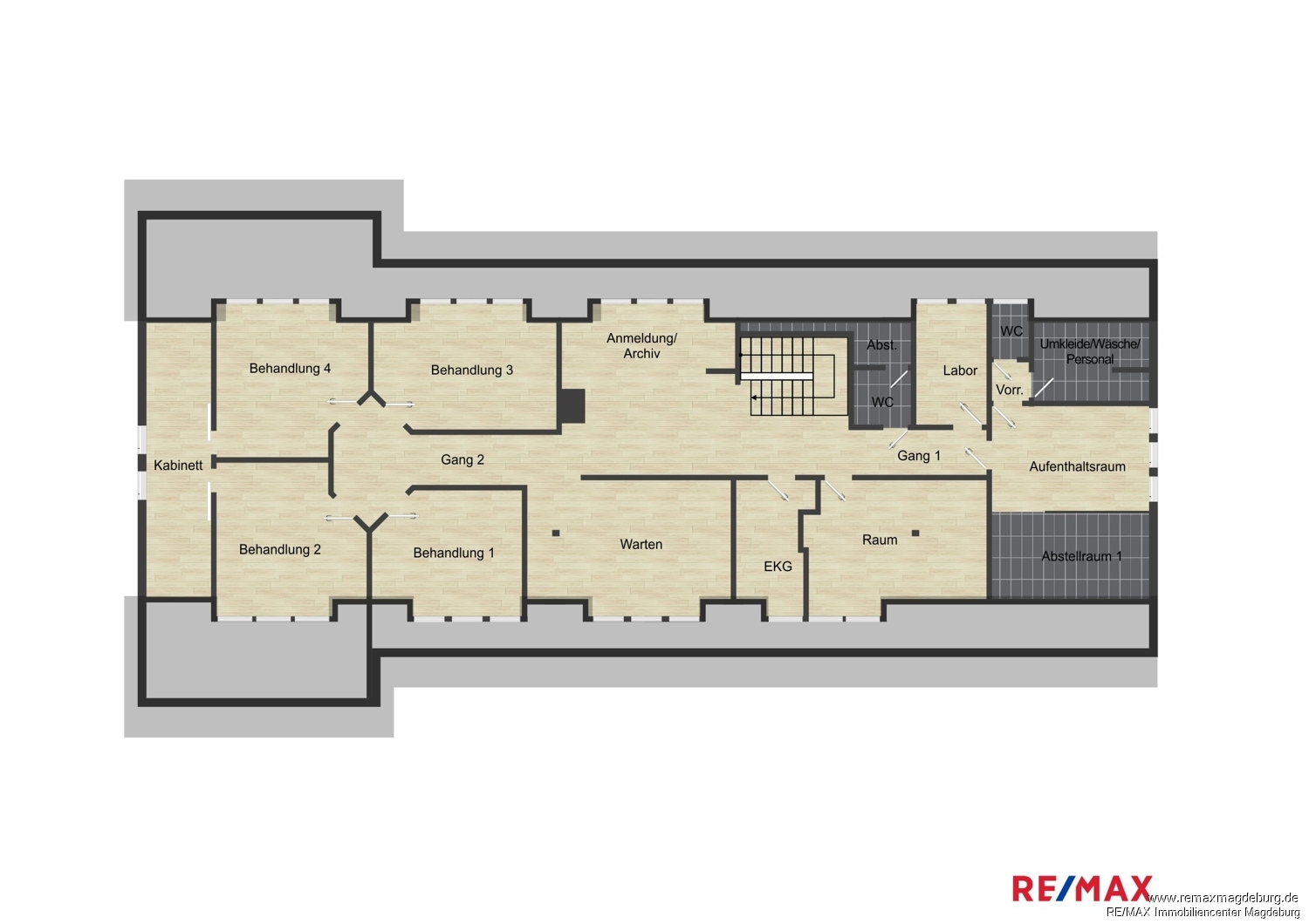 - Eingangsbereich mit Treppenaufgang, - großer Flur mit Patientenannahme, - Wartezimmer, - 4 Sprechzimmer, - mehrere Behandlungsräume, - Aktenlager, - geräumige Küche mit Einbauküche, - Duschbad, - Mitarbeiter-WC, - Patienten-WC, - Kellerraum,