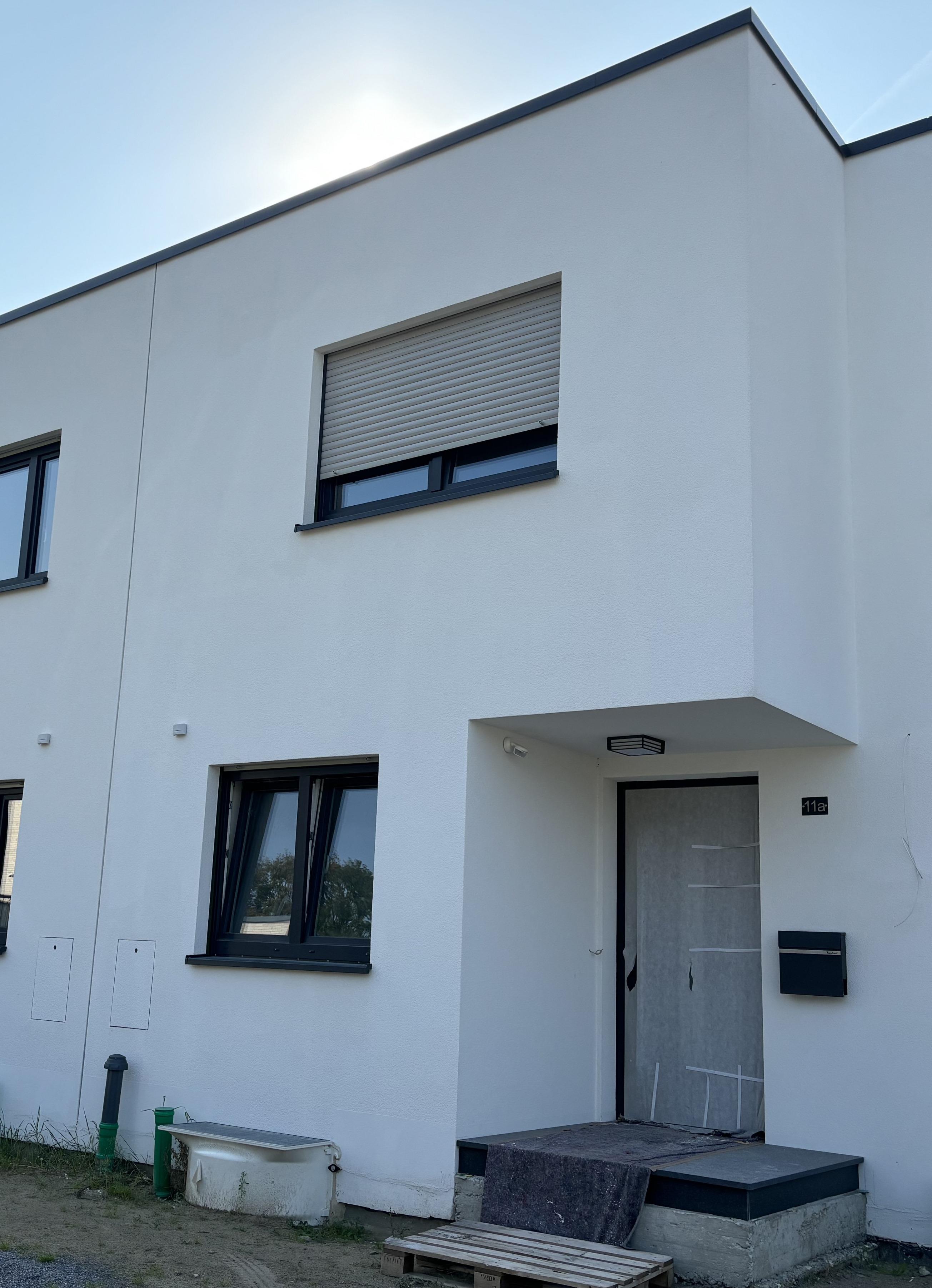 Reihenhäuser, 2gesch. Bauweise, Flachdach. Die Häuser erhalten eine Putzfassade Wärmedammverbundsystem. Teilflächen der Fassade werden mit einem Putz farbig abgesetzt, Vollkeller.