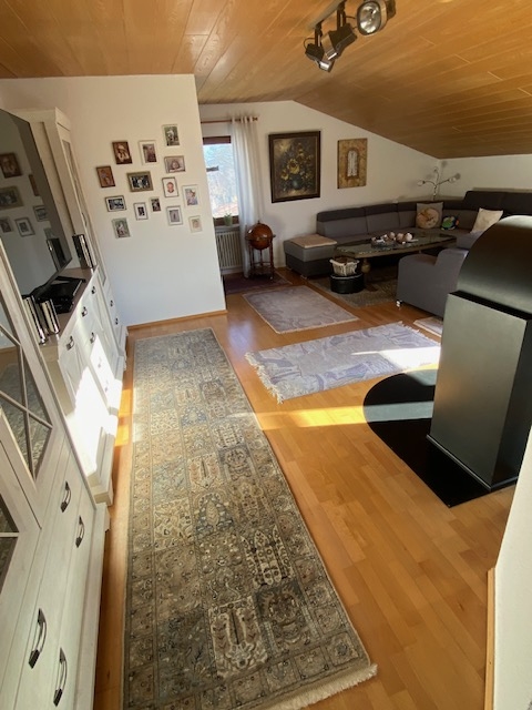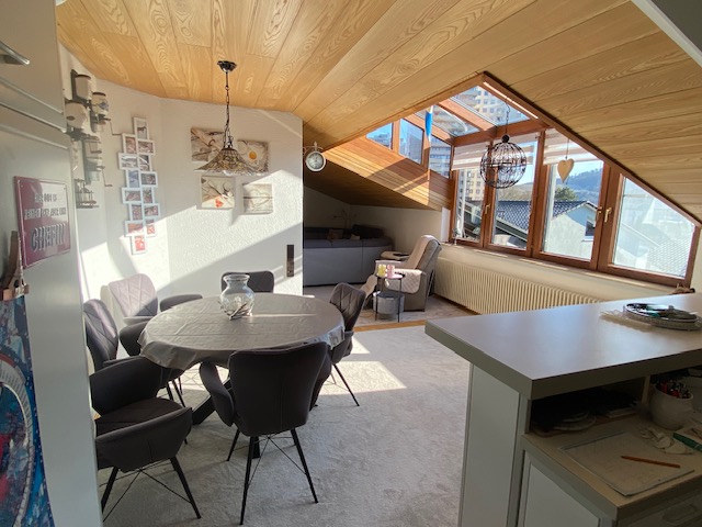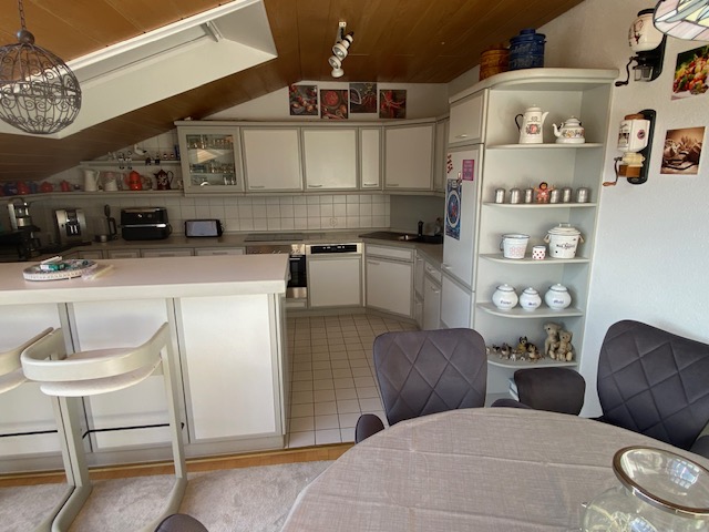 Dachgeschoss (DG): •ca. 103 m² Wfl. Wohnfläche nach DIN •3,5 Zimmer, davon 2 Schlafräume •Wohnküche •Wohnzimmer offen zur Küche •Kaminofen •EBK mit Elektrogeräten •Badezimmer mit Tageslicht, Badewanne, Dusche, WC •Wände Putz, Decken Holz •Parkettboden in den Wohn- und Schlafräumen, Fliesen im Bad/WC, •Abstellraum •Freisitz im Garten, zugeordnet