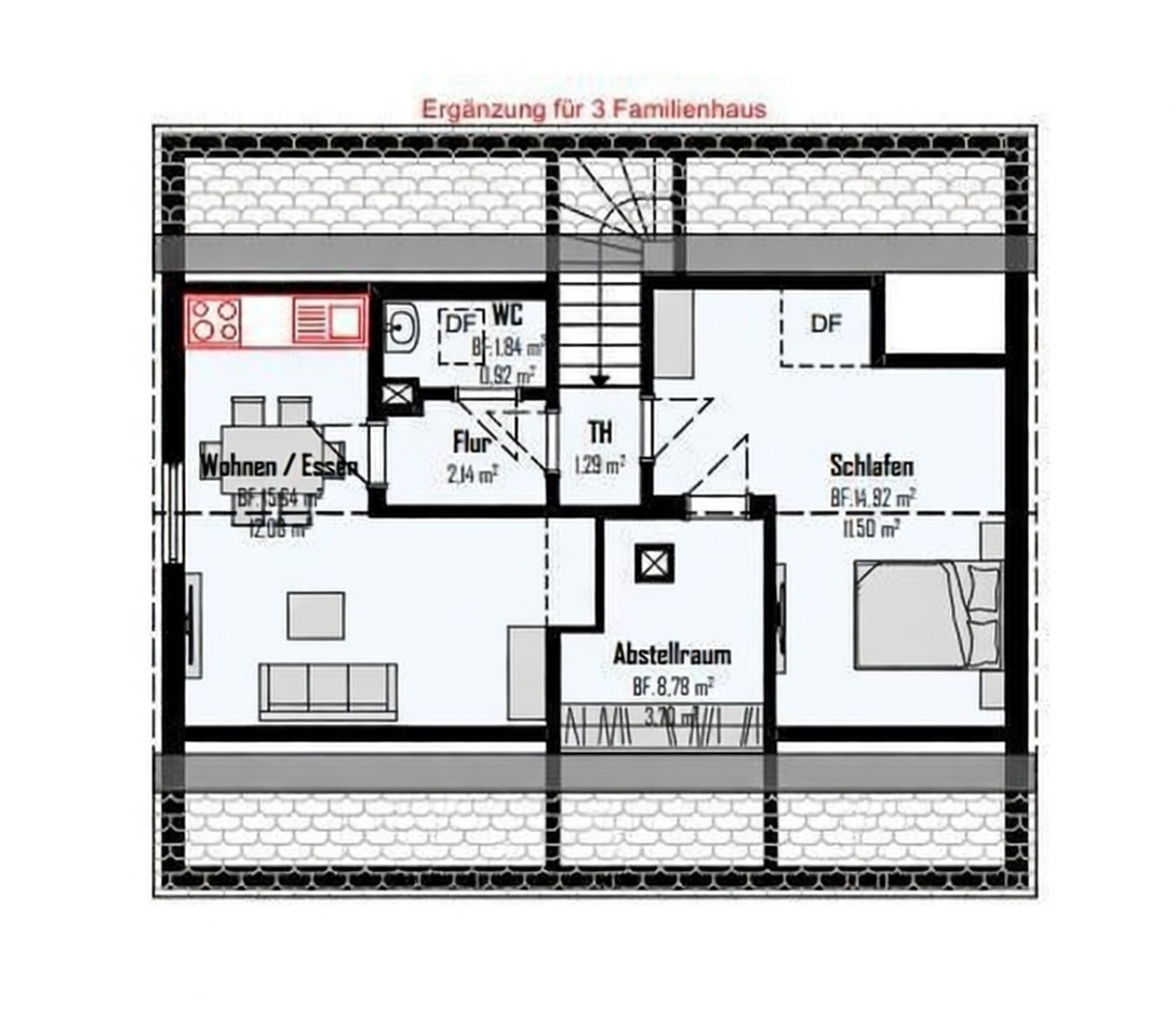 Das Dachgeschoss ist ausbaubar, z. B. zu einer dritten separaten Wohnung oder zu Homeoffice-Räumen.