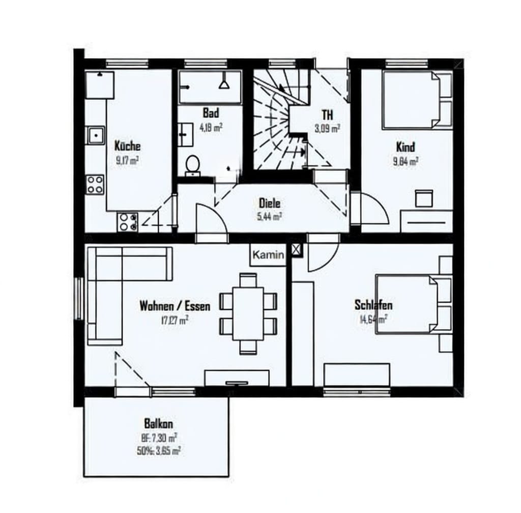 Das Erdgeschoss umfasst einen hellen Eingangsbereich, einen Wohn- und Essbereich mit Kaminofen und Steinrückwand, eine hochwertige Einbauküche sowie ein modernes Bad (behindertengerecht, erneuert 2015). Die Böden sind mit hellem Terrakotta-Optik Fliesen ausgelegt, die Decken weiß mit Holzoptik.