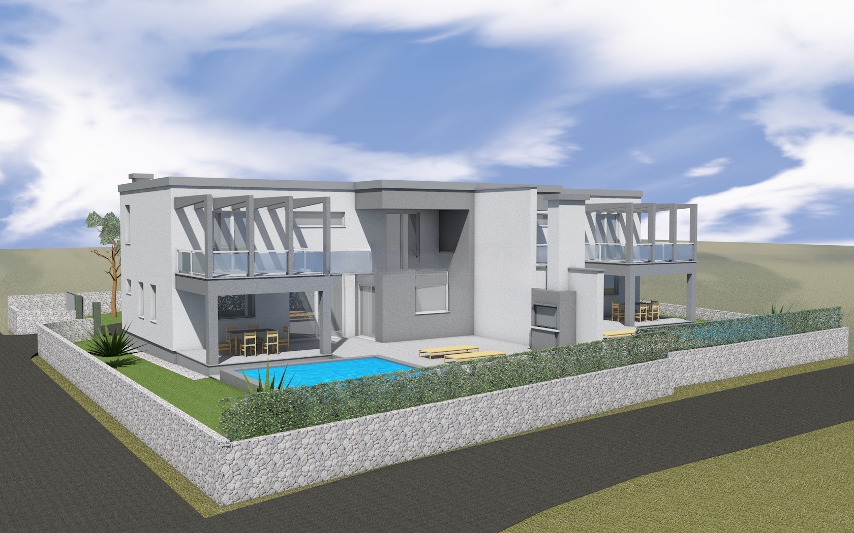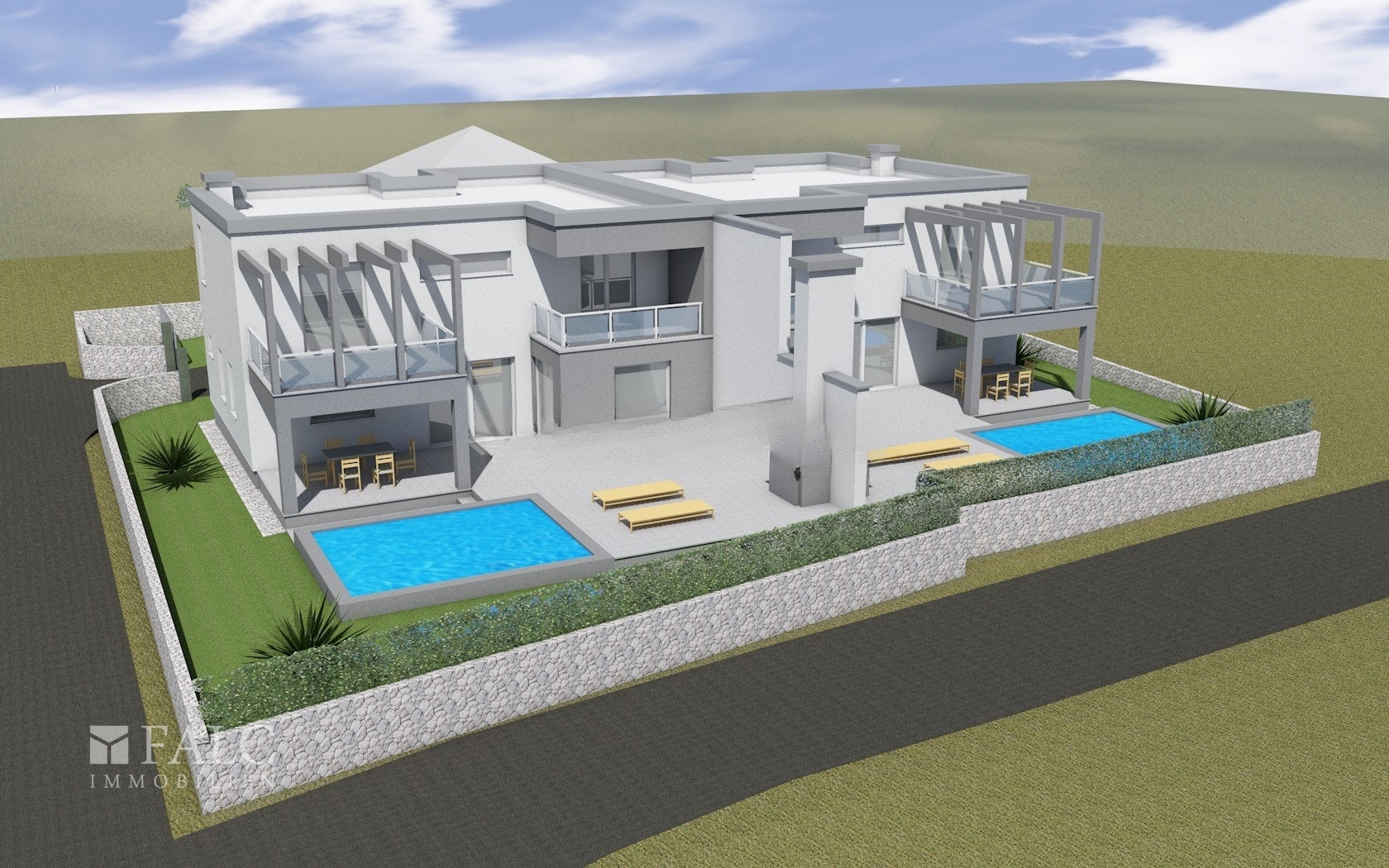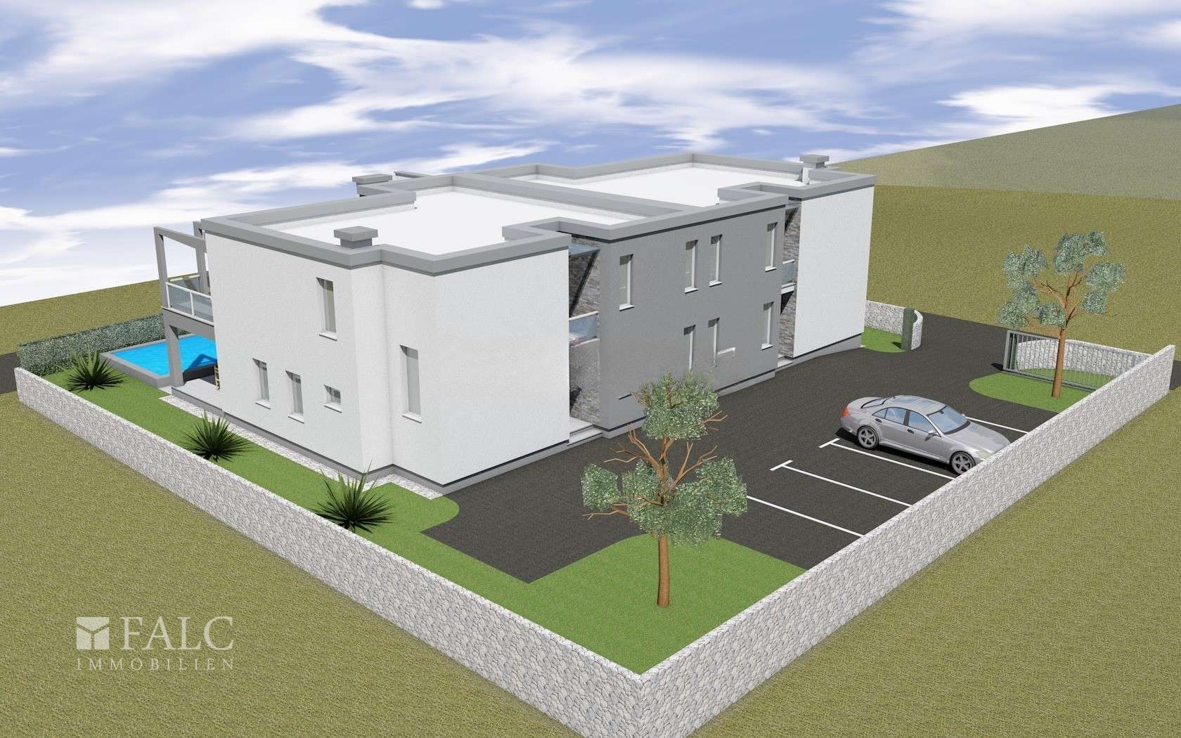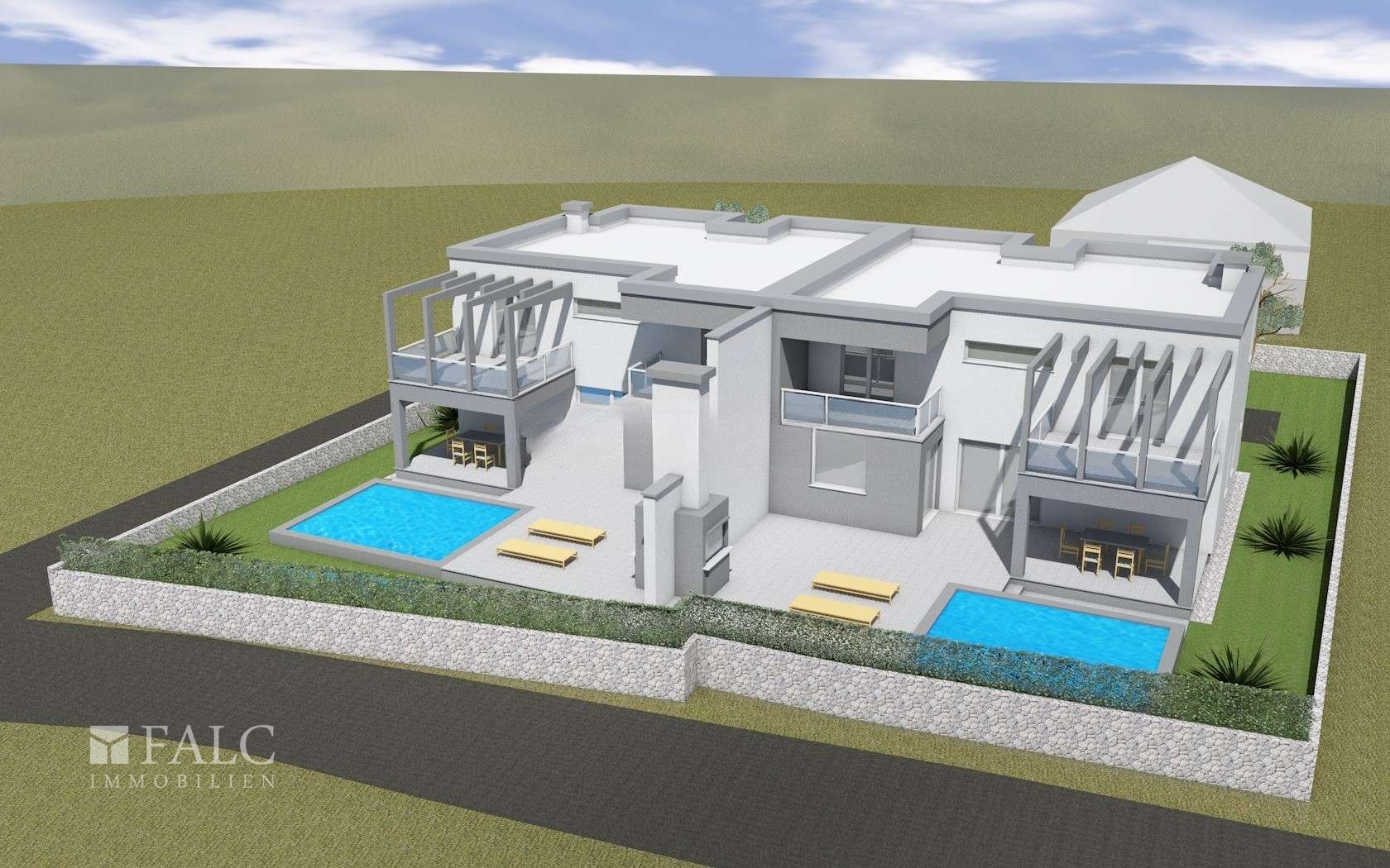 Andreas Franzke von FALC Immobilien präsentiert Ihnen hier einen wahren Luxuswohnraum! Zum Verkauf steht ein modernes Doppelhaus in einer charmanten, kleinen Stadt nahe dem Meer, unweit von Zadar. Das Doppelhaus wird in diesem Jahr fertiggestellt und überzeugt durch eine zeitgemäße Architektur sowie ein durchdachtes Wohnkonzept. Beide Haushälften sind spiegelgleich aufgebaut und bieten jeweils ein hohes Maß an Privatsphäre. Zur Immobilie gehören insgesamt 4 Außenstellplätze, die ausreichend Platz für Bewohner und Gäste bieten. Jede Haushälfte verfügt zudem über einen eigenen privaten Pool mit ca. 20 m² Größe.