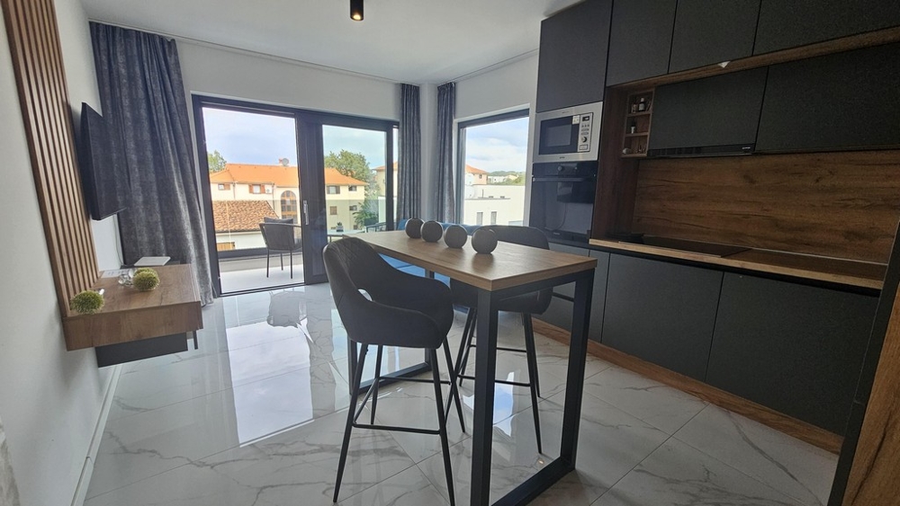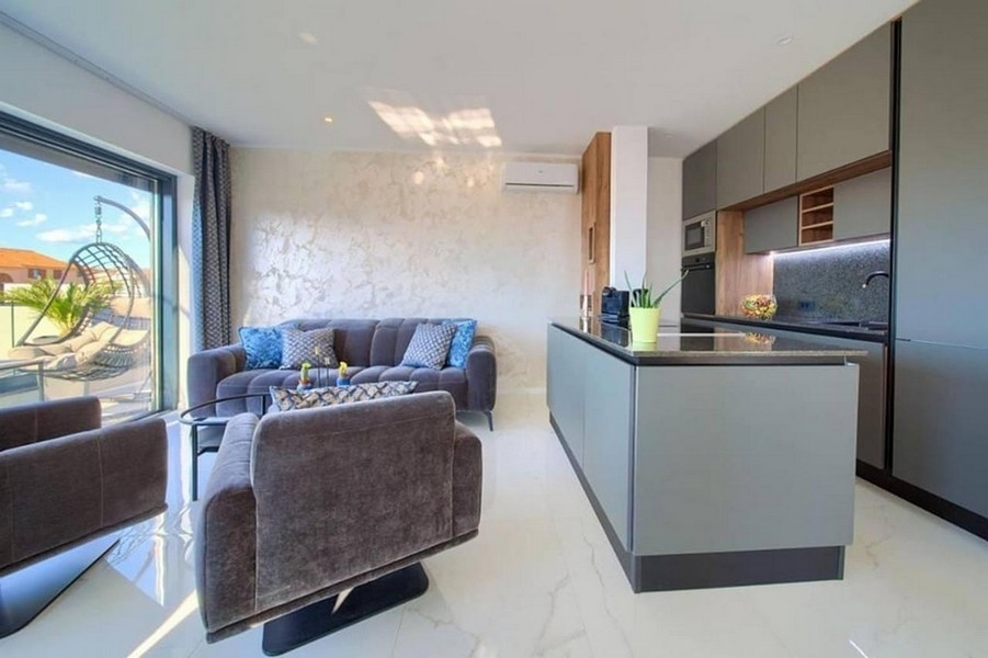 Wohnung B verfügt über ein Schlafzimmer, ein Badezimmer, ein Wohnzimmer mit offener Küche und Essbereich sowie einen Balkon mit Meerblick.