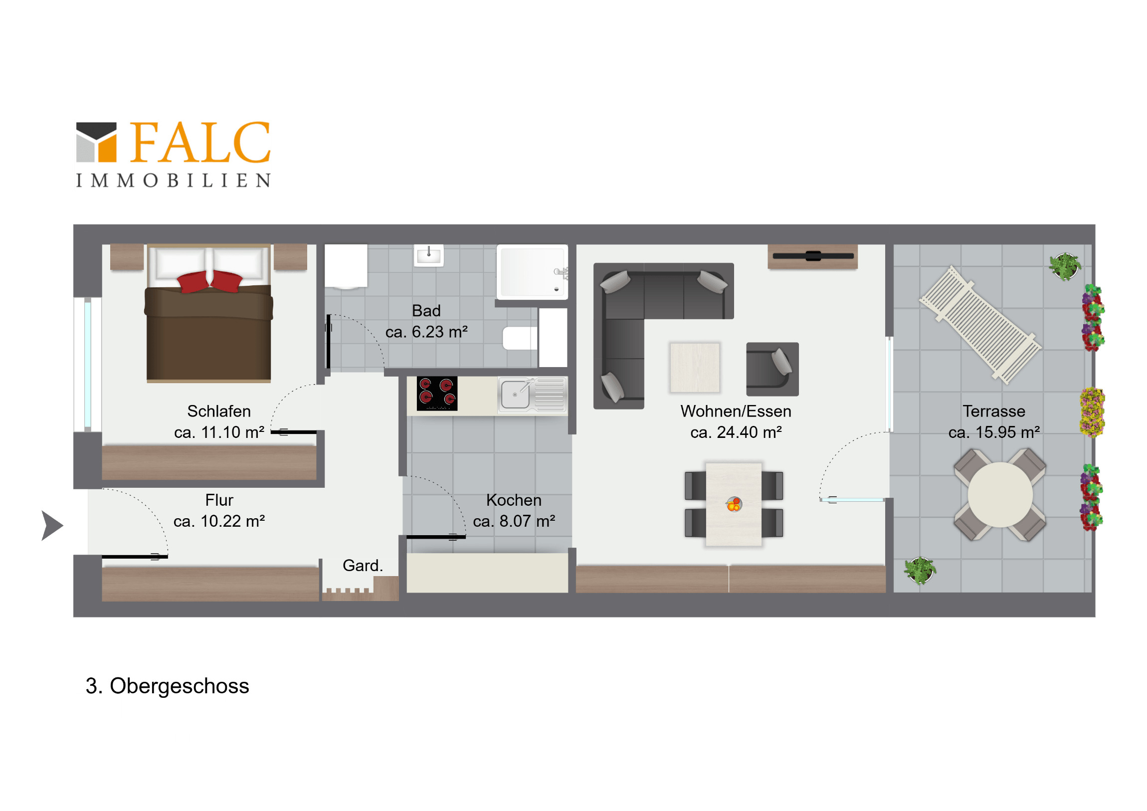 - Diele mit Garderobe - Schlafzimmer - Badezimmer mit Dusche - Offene Küche mit Einbauküche - Offener Wohn- und Essbereich - Großer Balkon mit Ostausrichtung