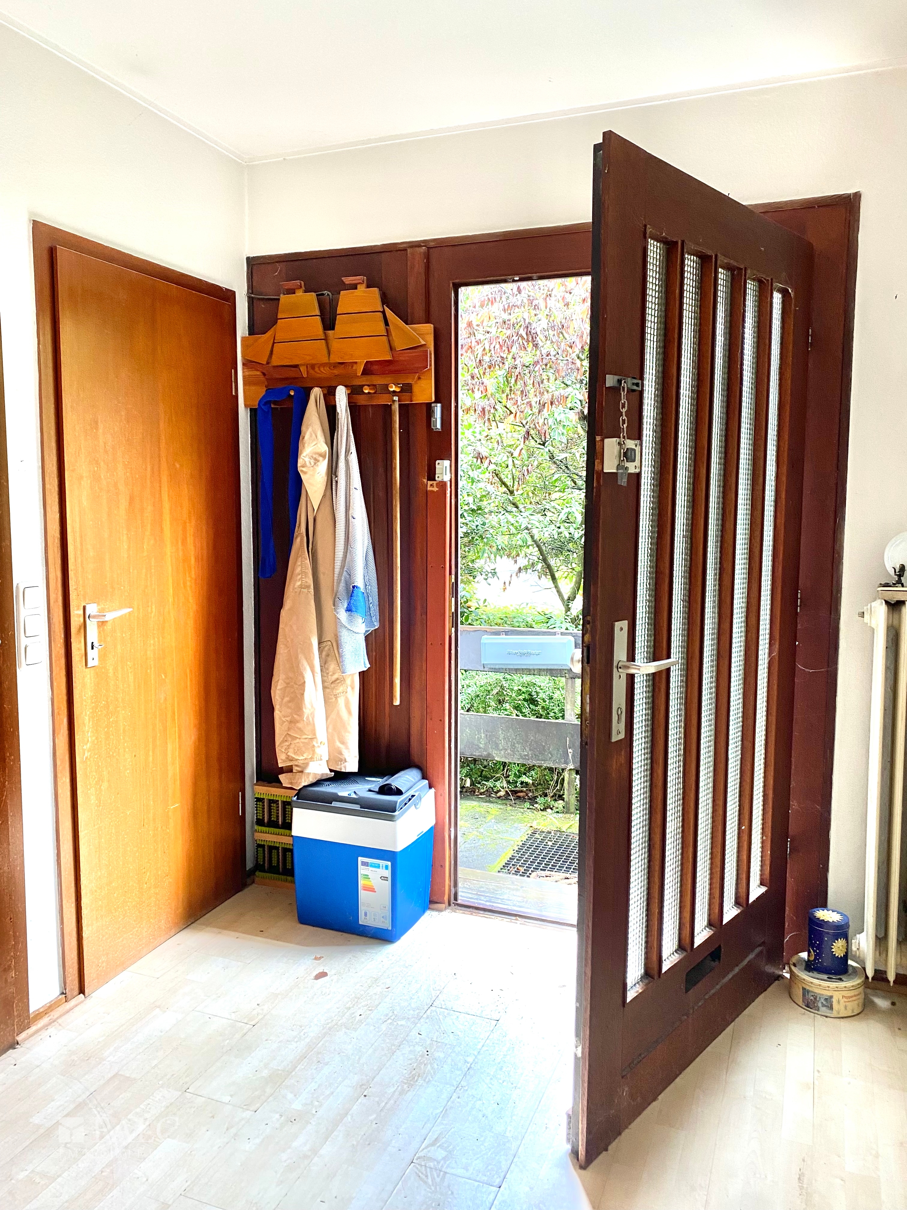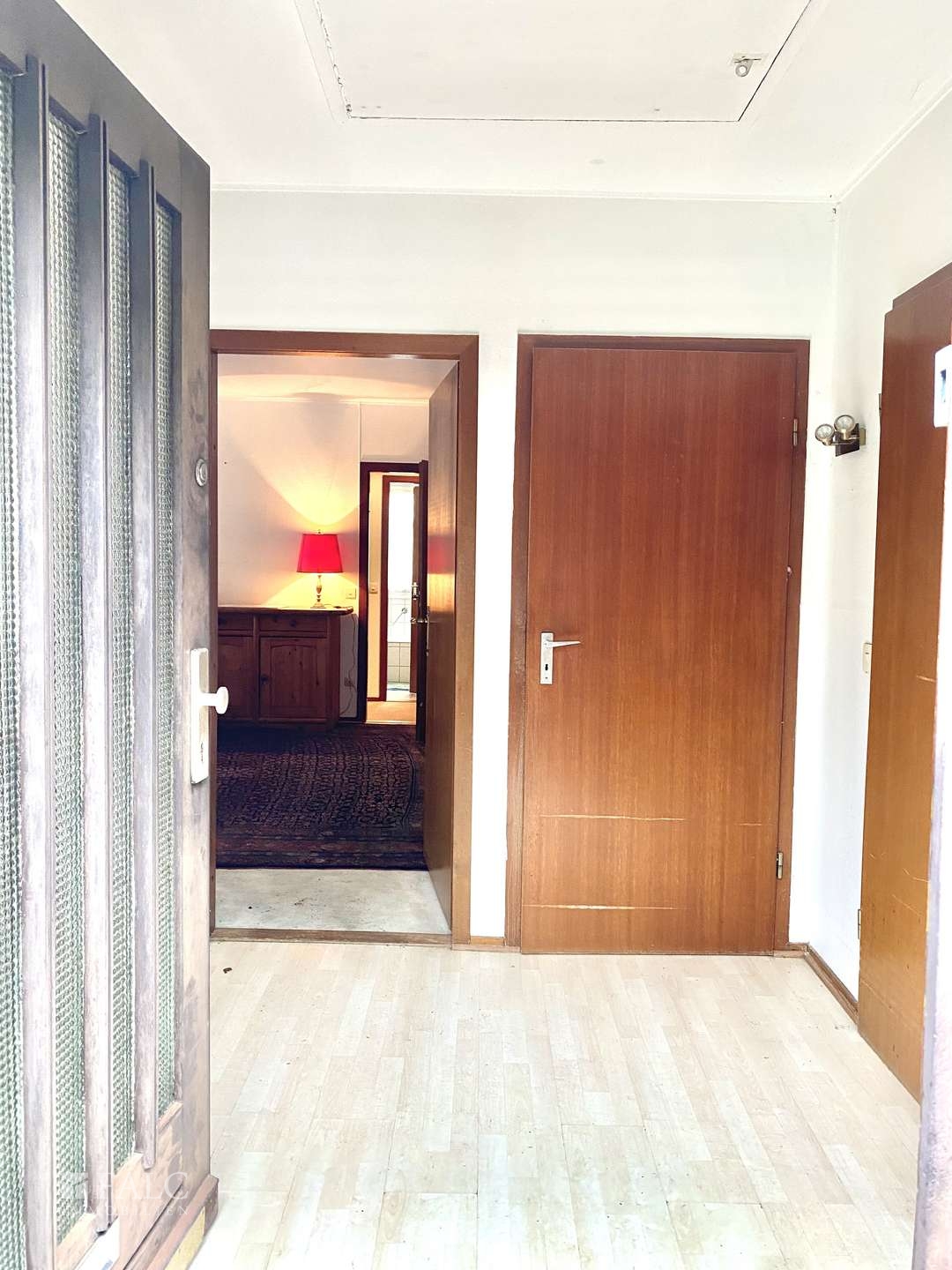 An Ihrer Garage vorbei gelangen Sie in den Eingangsbereich Ihres Einfamilienhauses. Im Eingangsbereich lässt sich dank der Größe eine Garderobe prima integrieren. Geradeaus befindet sich ein großer Raum, welcher derzeit als Schlafzimmer genutzt wird, aber ebenso gut als Arbeitszimmer umzufunktionieren ist. Eine Tür weiter befindet sich Ihr gemütlicher Wohnbereich mit Zugang auf den Balkon. Der Balkon bietet Ihnen einen ruhigen Rückzugsort mit Blick in den Garten. Am Wohnbereich vorbei führt Sie eine Tür in einen Flur, welcher Zugang zu zwei weiteren Räumen und dem Badezimmer bietet. Beide Zimmer werden derzeit als Büro genutzt. Eines der beiden Räume genießt ebenfalls einen direkten Zugang auf den Balkon. Das Badezimmer ist ausgestattet mit einer Badewanne, einem WC und einem Waschbecken.