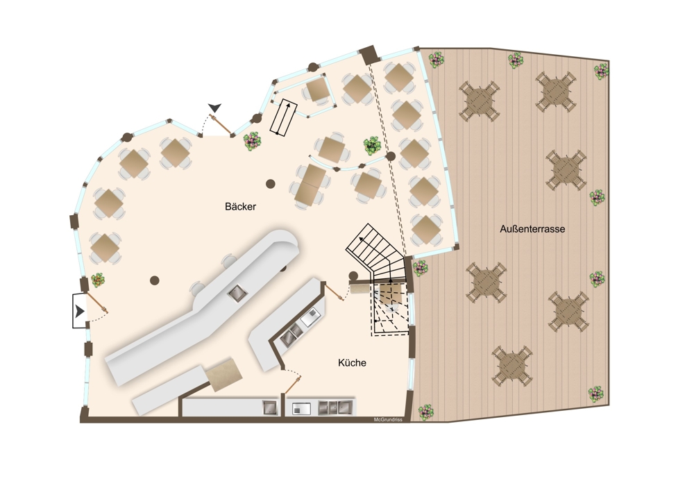 Der großzügige, helle Hauptraum mit angebautem schönen Wintergarten bietet viel Platz für Ihre Geschäftsidee und eine angenehme Raumatmosphäre. Eine ruhige, sonnige Außenterrasse bietet die Möglichkeit einer Bestuhlung.