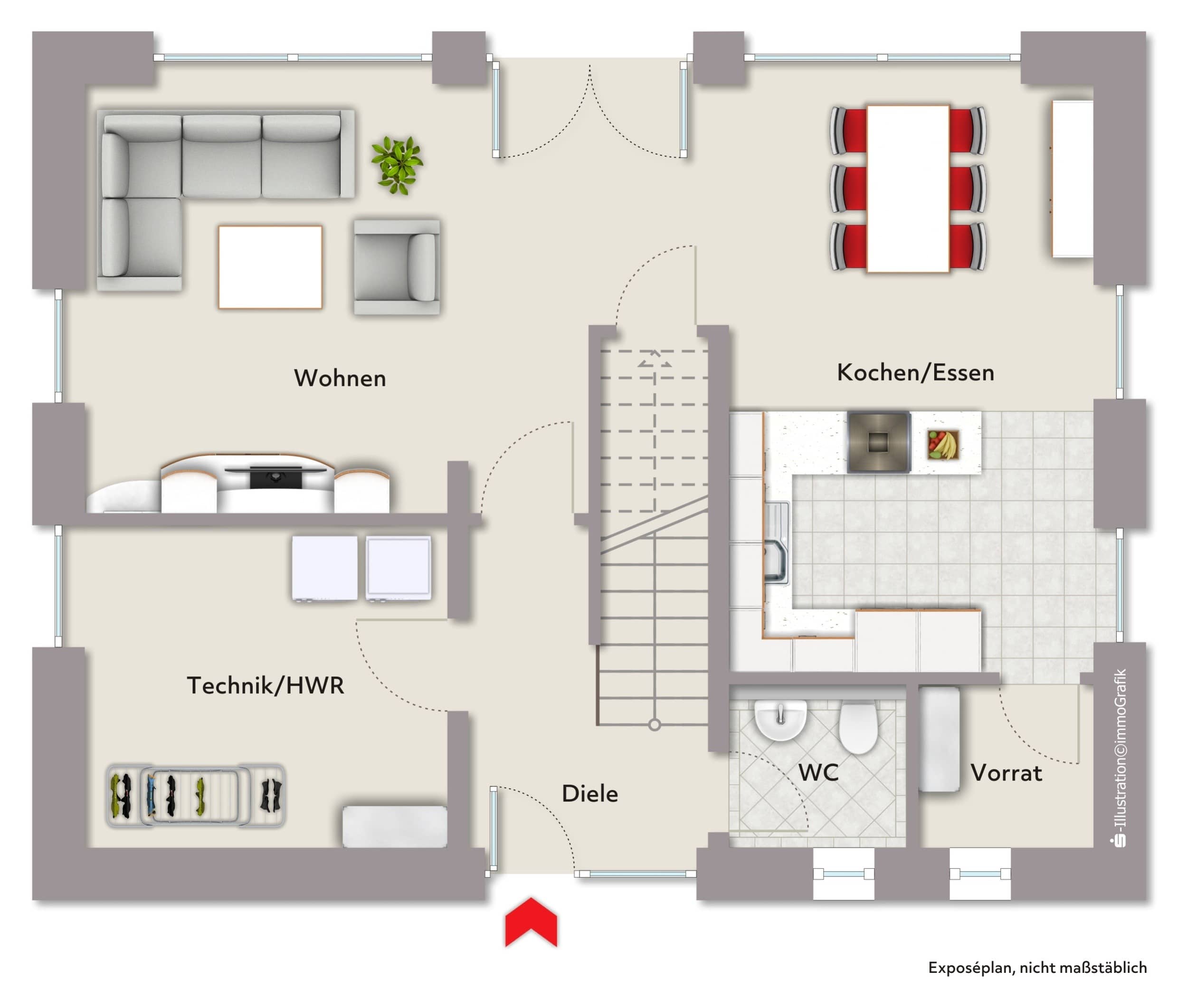 Die Fenster sind aus Kunststoff (außen grau, innen weiß) mit 3-fach-Wärmeschutzverglasung. RC2n-Sicherheitsbeschläge erhöhen den Einbruchschutz im Erdgeschoss. Der Wohnbereich wird durch ein bodentiefes Fensterelement zum Garten geöffnet. Im gesamten Erdgeschoss werden moderne Bodenfliesen verlegt. Es sind Fliesen bis zu einem m²-Preis von € 40,00 im Kaufpreis enthalten. Zur Komfortausstattung im Badezimmer gehören ein Handtuchheizkörper, eine Wanne sowie ein bodengleich gefliester Duschbereich mit einer 2m hohen Duschabtrennung mit Tür aus Glas. Eine Wandflächenheizung ist nach Absprache mit dem Installateur möglich.