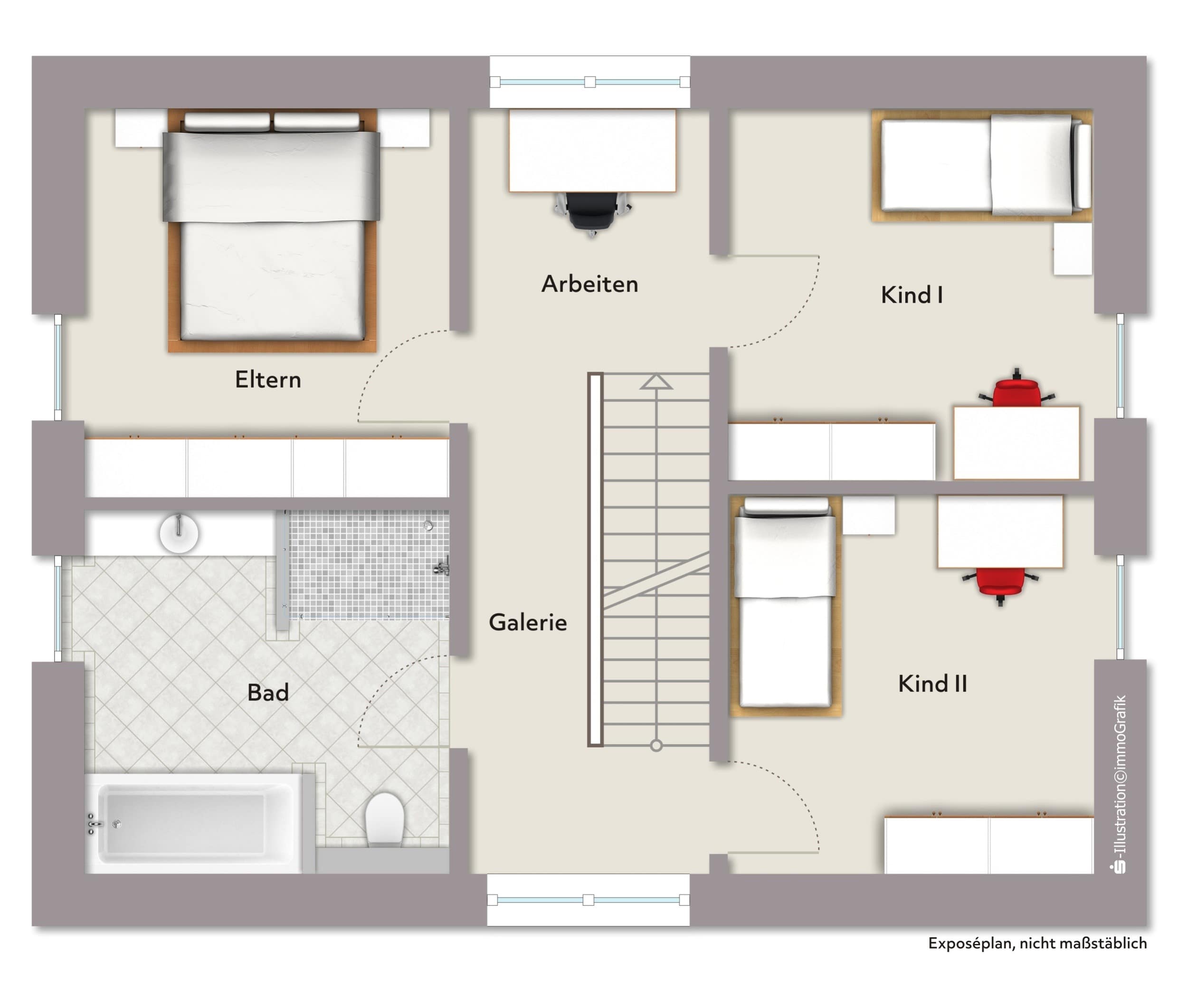 Insgesamt stehen 2 Grundstücke zur Verfügung, die alternativ mit Zweifamilienhäusern im Stil eines Doppelhauses bzw. mit Einfamilienhäusern bebaut werden können. Die vorliegende Einfamilienhaus-Planung kann auf jedem der Grundstücke realisiert werden.