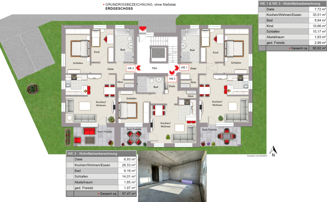 Die Häuser werden in konventioneller Bauweise (Stein auf Stein) im Neubaustandard nach GEG (Gebäudeenergiegesetz) im KfW40-Standard unter Verwendung hochwertiger Baumaterialien errichtet. Für das Gebäude wird ein Lüftungskonzept erstellt und alle notwendigen Fenster erhalten eine im Fensterprofil integrierte Pfalzlüftung. Die Fenster zur Bahn sind Schallschutzfenster, um eine ruhige Wohnatmosphäre zu gewährleisten. Als umweltfreundliche Heizlösung kommt eine Erdwärmepumpe zum Einsatz, die nicht nur den KfW40-Energieeffzienzstandard erfüllt, sondern auch zu Energieeinsparungen führt. Zudem wird auf dem Dach eine 9 kWp PV-Anlage installiert, die den Gemeinschaftsstrom abdeckt und damit zur Reduzierung der Betriebskosten beiträgt.