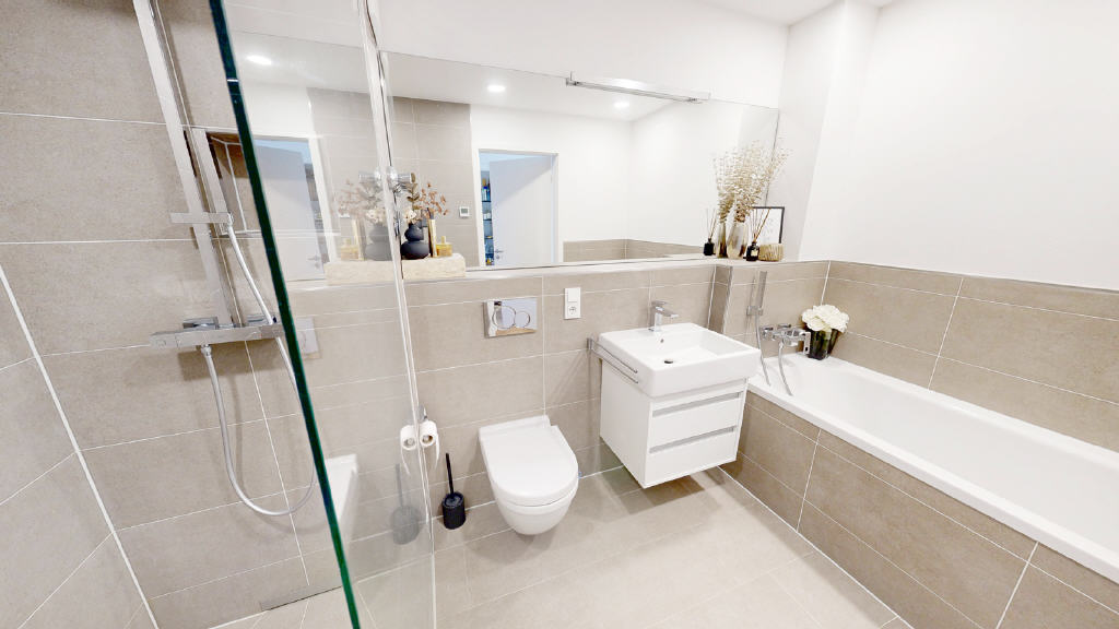 In moderner Farbgebung gefliest zeigt sich das elegante Badezimmer. Als besonderes Highlight verfügt dieses über eine verglaste Walk-In-Dusche mit Regenwald-Duschkopf. Die übrige Ausstattung beschreibt sich durch einen Waschtisch, ein WC sowie eine Badewanne. Integrierte Deckenspots schaffen zusätzlich eine moderne, elegante Wohlfühlatmosphäre.