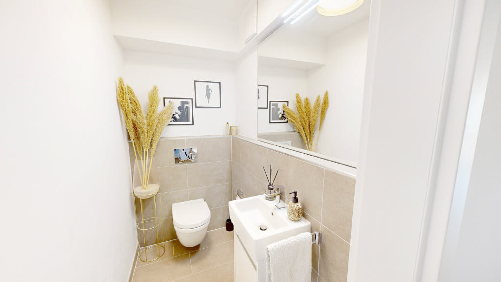 In gleicher Farbgebung gefliest präsentiert sich das angrenzende Gäste-WC. Ein Waschtisch und ein WC beschreiben hier die Ausstattung.