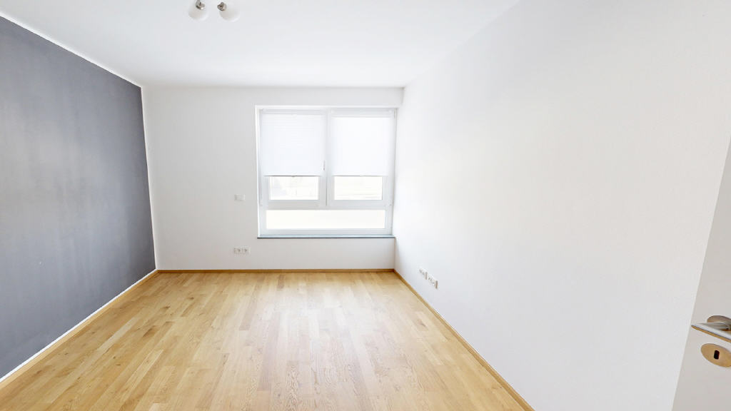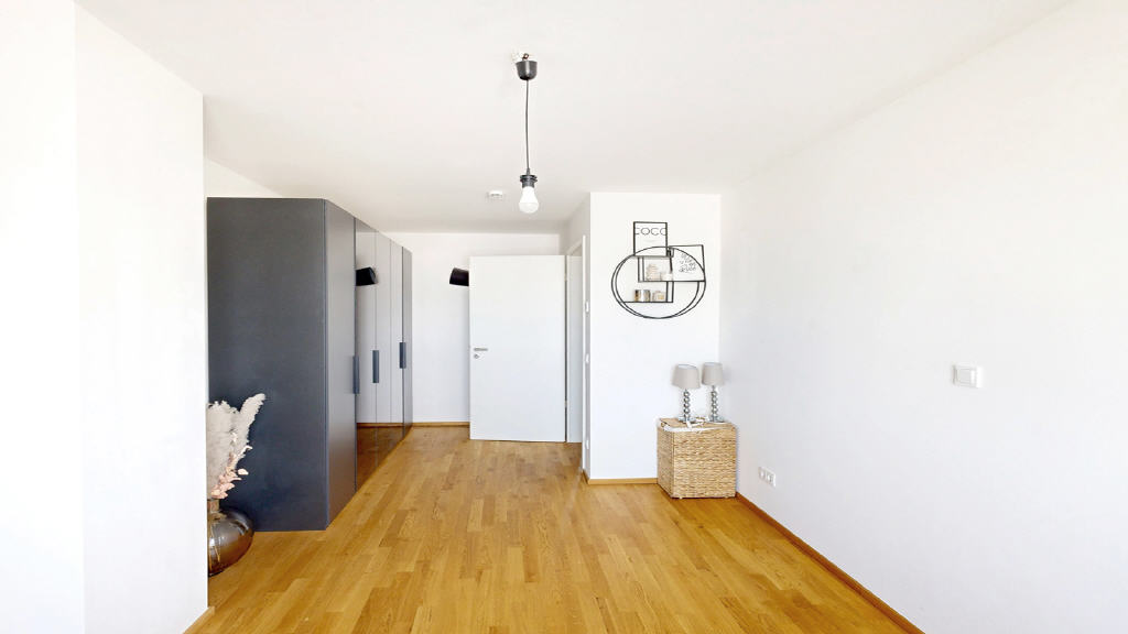 Das Hauptschlafzimmer sowie das Kinderzimmer/Büro präsentieren sich mit einem ebenmäßigen Grundriss, welcher sich ideal allen Gestaltungswünschen anpasst. Eine große Fensterfläche erfüllt die Räumlichkeiten mit viel Tageslicht.