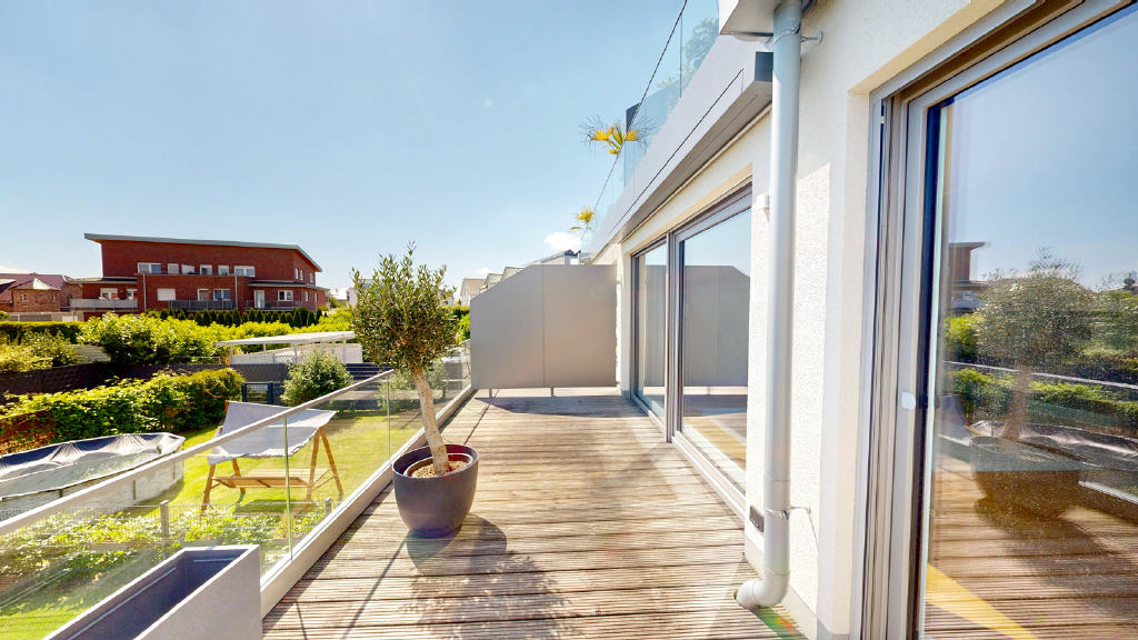 Der dem Wohnzimmer vorgelagerte Balkon erstreckt sich über die gesamte Zimmerbreite und ist sonnenoptimal nach Süden ausgerichtet. Er gewährt ausreichend Platz für eine gemütliche Sitzgarnitur, die zum Verweilen einlädt. Eine elektrische sowie beleuchtete Markise spendet bei Bedarf ein schattiges Plätzchen.