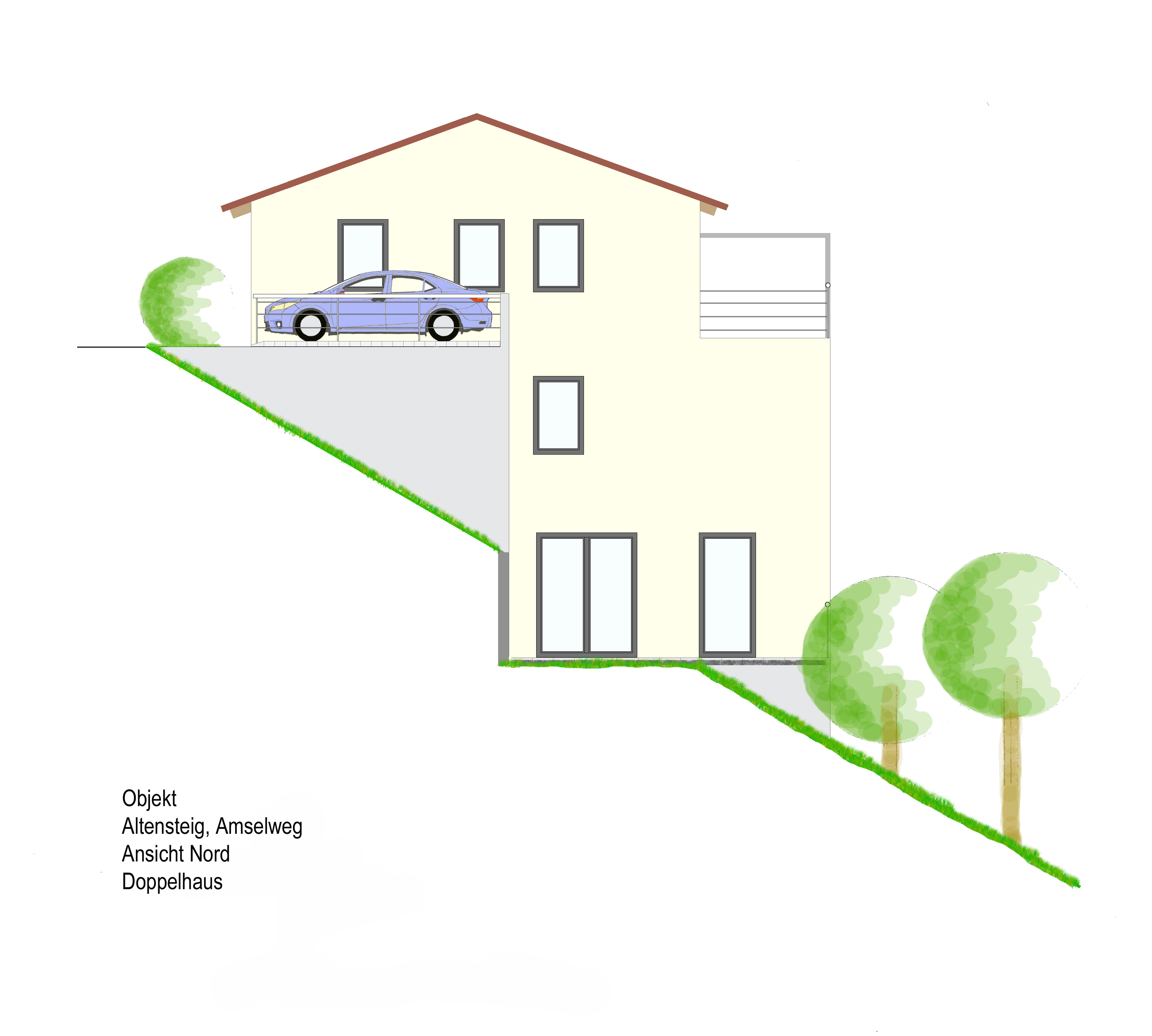 2 PKW-Stellplätzen pro Haus direkt neben dem Hauseingang. Einen über 16 m² großen Balkon am EG-Wohnbereich mit toller Fernsicht. Und im Gartengeschoss nochmals eine große Gartenterrasse mit teils geebneter Gartenfläche im Hang. Mehr siehe Entwürfe und Grundrisse der Vorplanung. Überschaubare Bauzeit durch Systemhaus Vorfertigungen möglich. Sie erhalten eine ausführliche Baubeschreibung bei entsprechender Festlegung des Haustyps und Hersteller.