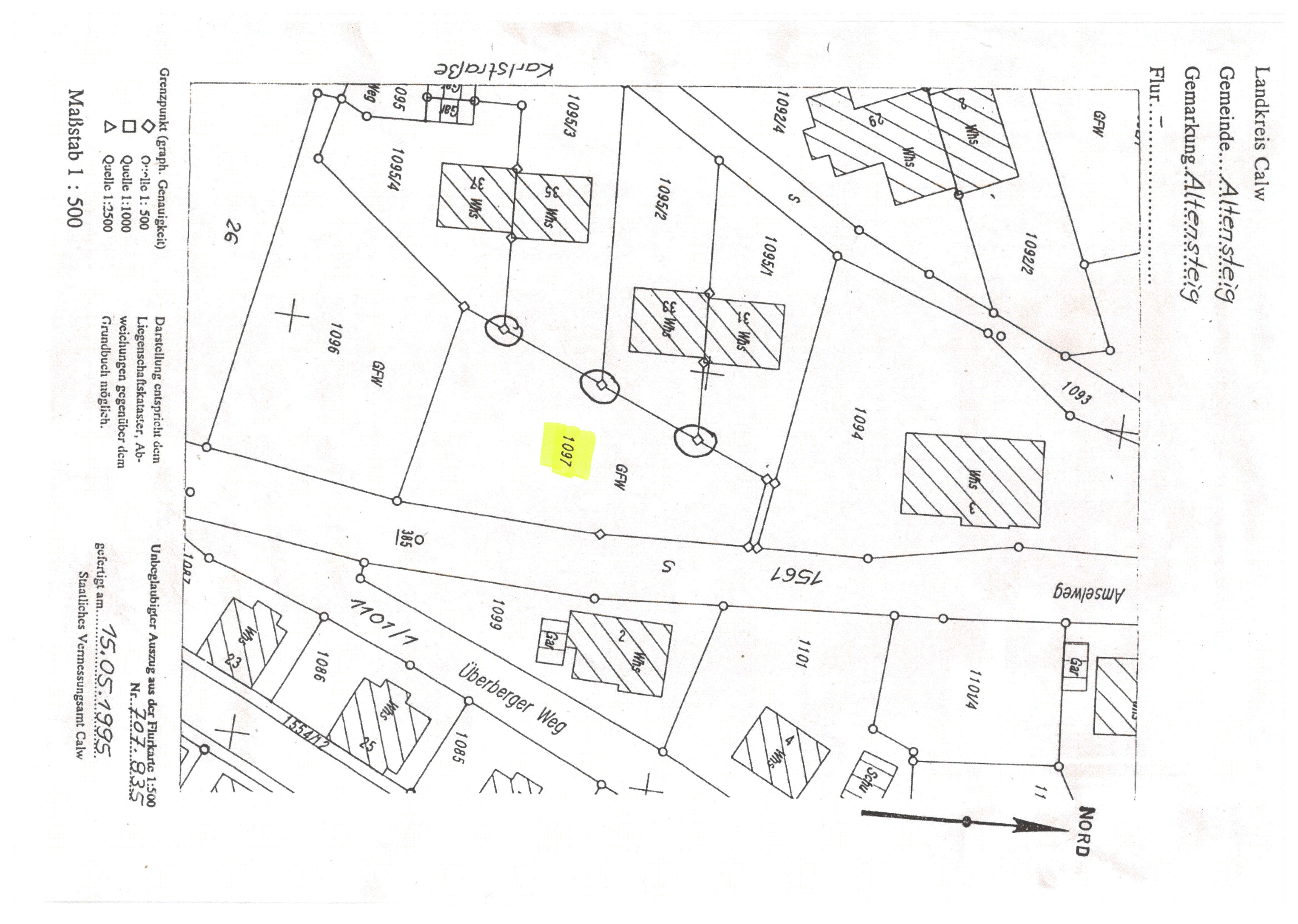 Ruhiges und bürgerliches Wohnbau-Gebiet. Der Amselweg, Flurstück 1097, vermutlich Hausnummer 1, liegt in Höhenlage mitten in der kleineren, aber sehr charmanten Schwarzwaldstadt Altensteig. Die Einwohnzahl liegt bei knapp 11.000. Neben der tollen Fernsicht, ist hier oben die tägliche Versorgung mit Bäcker, Schulen und Kindergarten gegeben. Alle anderen Versorgungen des Alltags befinden sich nicht weit weg und sind überwiegend "unten" in der Kleinstadt.