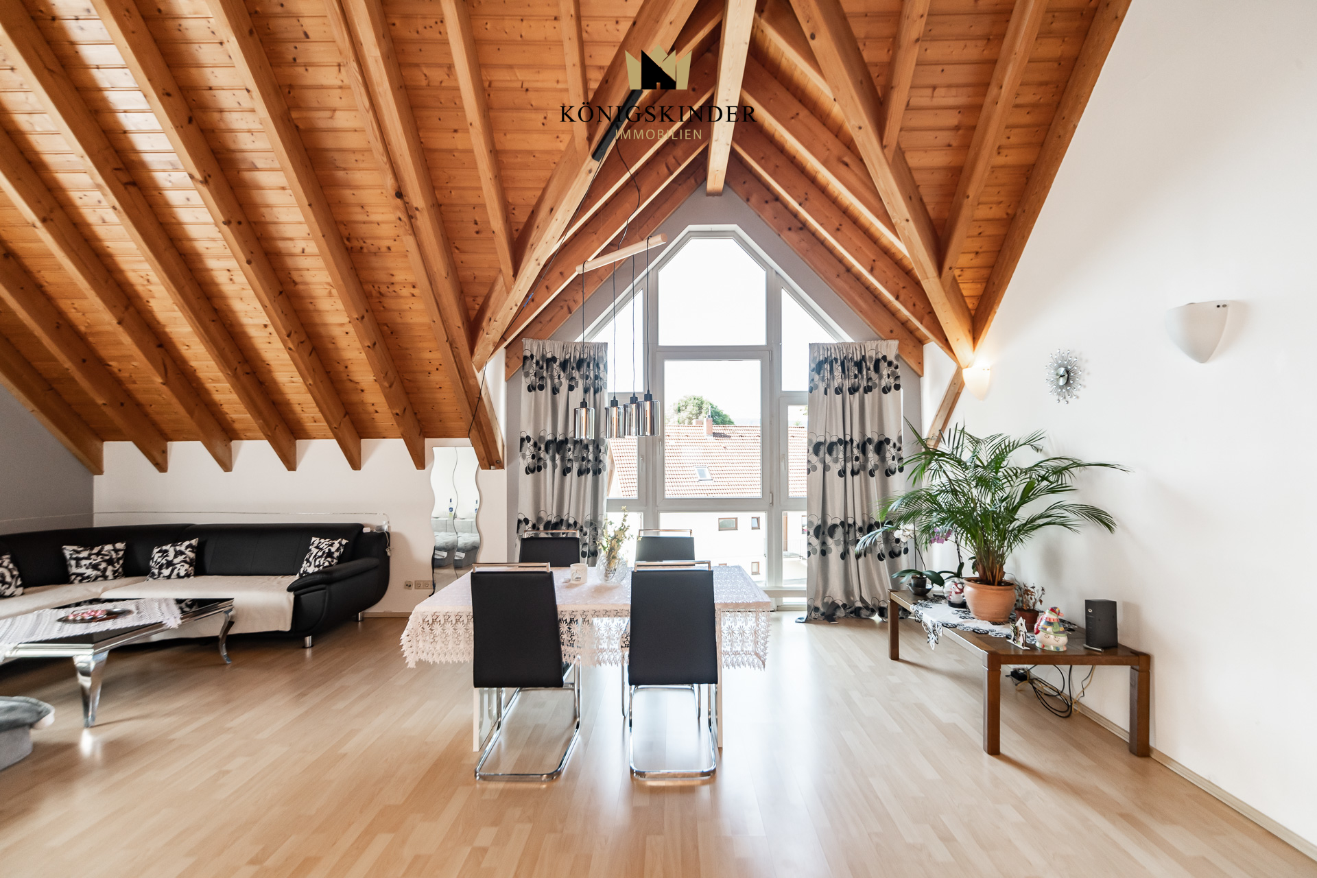 Das erwartet Sie: Lichtdurchflutetes Wohnen unter dem Dach Der offene Wohn- und Essbereich beeindruckt mit großflächiger Fensterfront, hoher Decke und freigelegtem Sichtgebälk. Die Architektur unter dem Satteldach verleiht der Wohnung ein luftiges, großzügiges Wohngefühl mit besonderem Charakter.