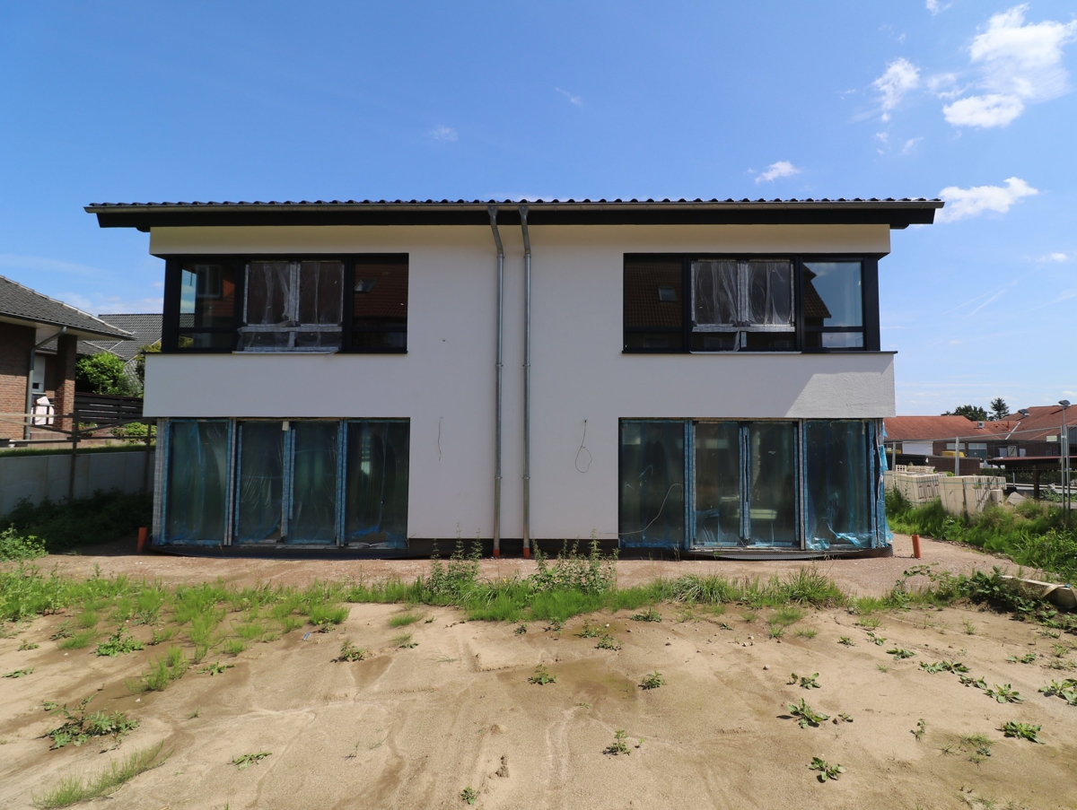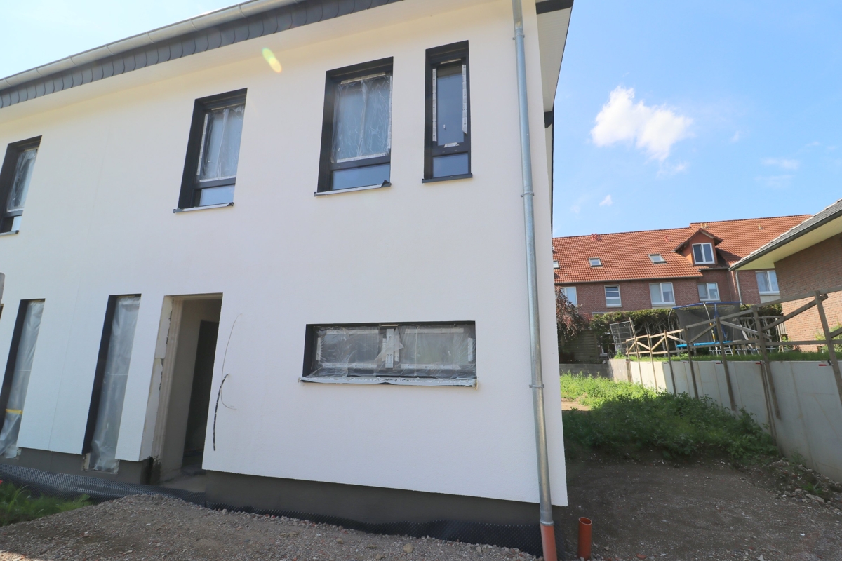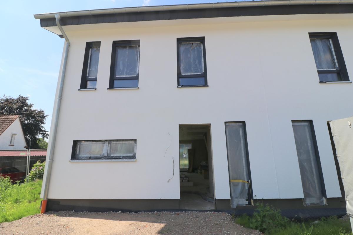 Willkommen im neuen Zuhause – Einzug 2026! Auf einem ca. 600 m² großen Grundstück entstehen aktuell zwei moderne Doppelhaushälften. Die Fertigstellung ist für Anfang 2026 geplant. Noch haben Sie die Möglichkeit, viele Ausstattungsdetails wie Bodenbeläge, Badausstattung und Innentüren nach Ihren persönlichen Wünschen zu gestalten. Raumkonzept – durchdacht und familienfreundlich Jede Doppelhaushälfte bietet ca. 120 m² Wohnfläche, verteilt auf zwei Etagen mit insgesamt vier Zimmern. Im Erdgeschoss befinden sich: •ein Gäste-WC •ein praktischer Hauswirtschaftsraum •ein großzügiger Wohn- und Essbereich mit offener Küche und Zugang zur Terrasse mit Blick in den Garten Im Obergeschoss erwarten Sie drei helle, gut geschnittene Schlafzimmer, die sich ideal als Kinderzimmer, Büro oder Gästezimmer nutzen lassen. Zusätzlich steht Ihnen ein komfortables Badezimmer zur Verfügung – ausgestattet mit einer modernen Dusche und einer entspannenden Eckbadewanne.