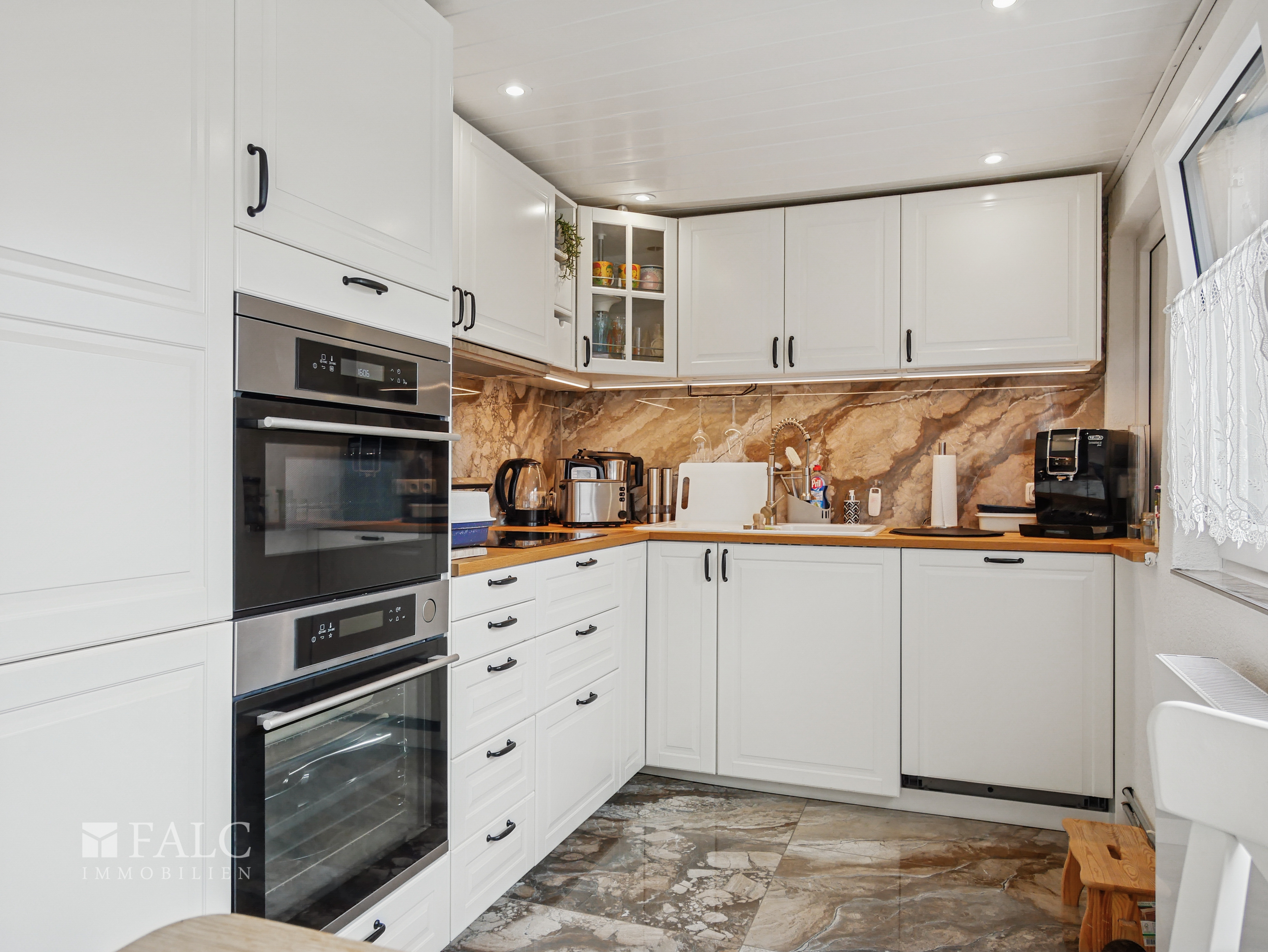 Weiter geht es in die Küche, die vollständig eingerichtet, modern und zeitlos ist. Durch den Landhausstil der Schränke und den tollen Fliesen in Marmoroptik als Fliesenspiegel und Bodenbelag lädt diese Küche regelrecht zum Kochen mit dem Partner oder der Familie ein!