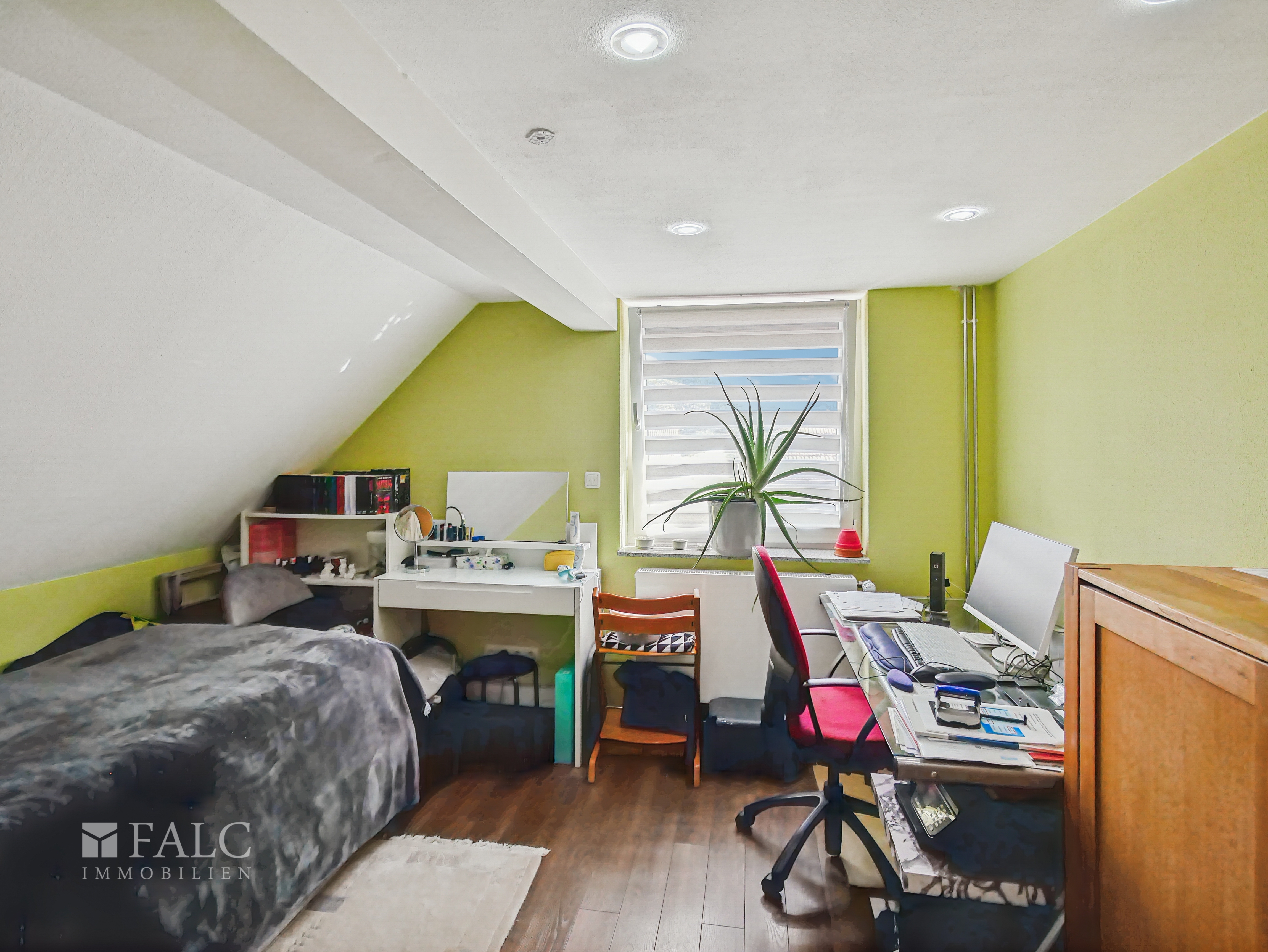 Die Wohnung, ca. 100m² Wohnfläche, hat auf ihrer ersten Ebene schon alles was Sie brauchen. Alle Räume gehen direkt vom Flur ab. Angefangen mit dem Schlafzimmer und dem Kinder/-Arbeitszimmer, welche trotz ihrer Dachschrägen sehr geräumig sind.