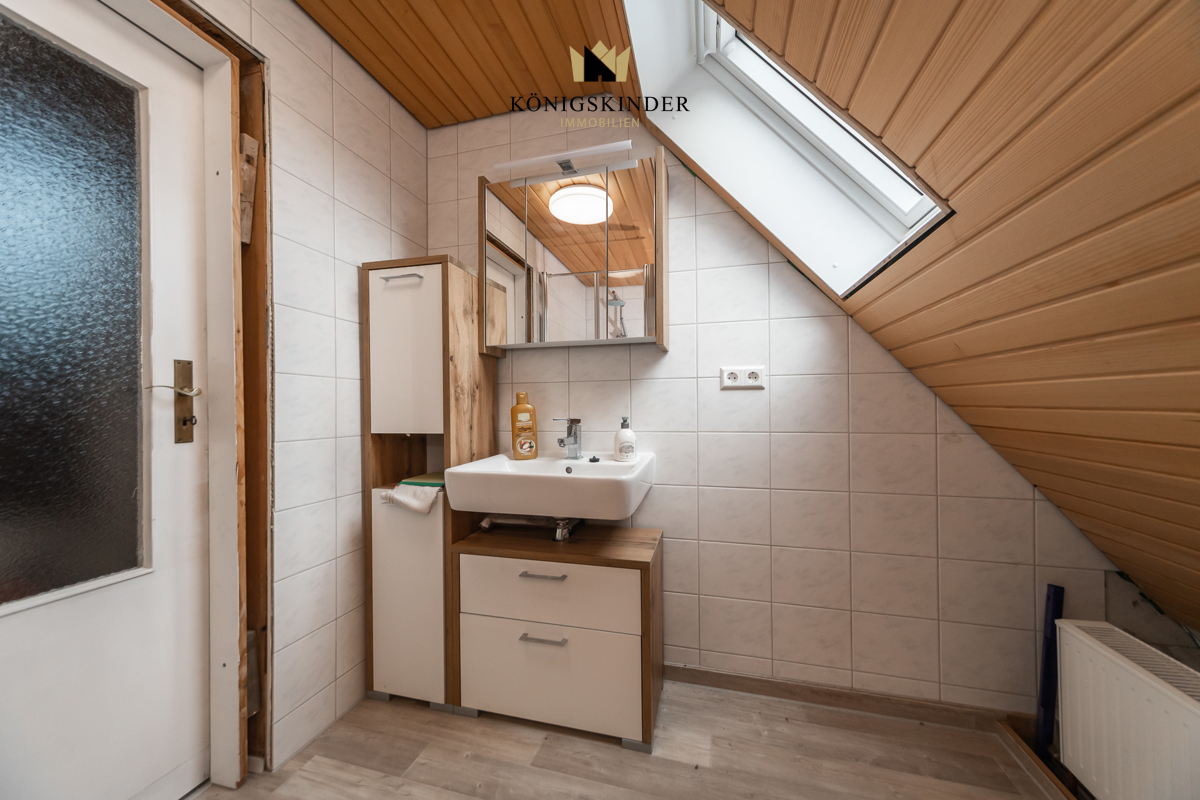 Im Dachgeschoss steht ein weiteres Duschbad und das geräumige Schlafzimmer zur Verfügung. Bei Bedarf können weitere Wohnräume im Dachgeschoss ausgebaut werden. Die Vorbereitungen sind bereits erfolgt.