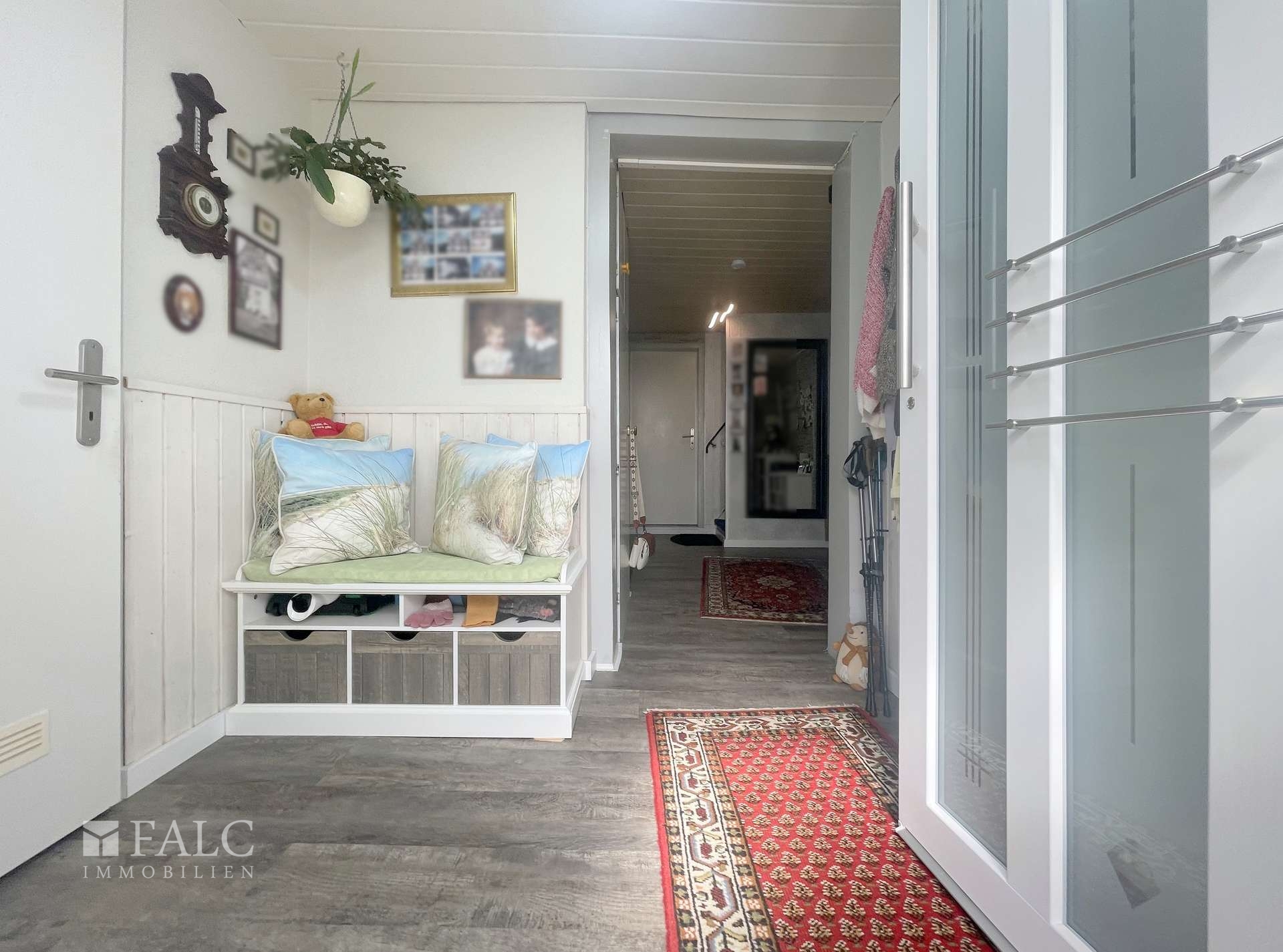 Ein Einbauschrank im Flur sorgt für zusätzlichen Stauraum und nutzt den vorhandenen Platz optimal aus. Vor dem Haus lädt eine schöne Terrasse zum Verweilen ein, während der großzügige Garten vielfältige Nutzungsmöglichkeiten bietet. Das dort vorhandene Gewächshaus eignet sich ideal für Hobbygärtner, und ein kleiner Schuppen bietet zusätzlichen Platz für Gartengeräte oder Fahrräder.