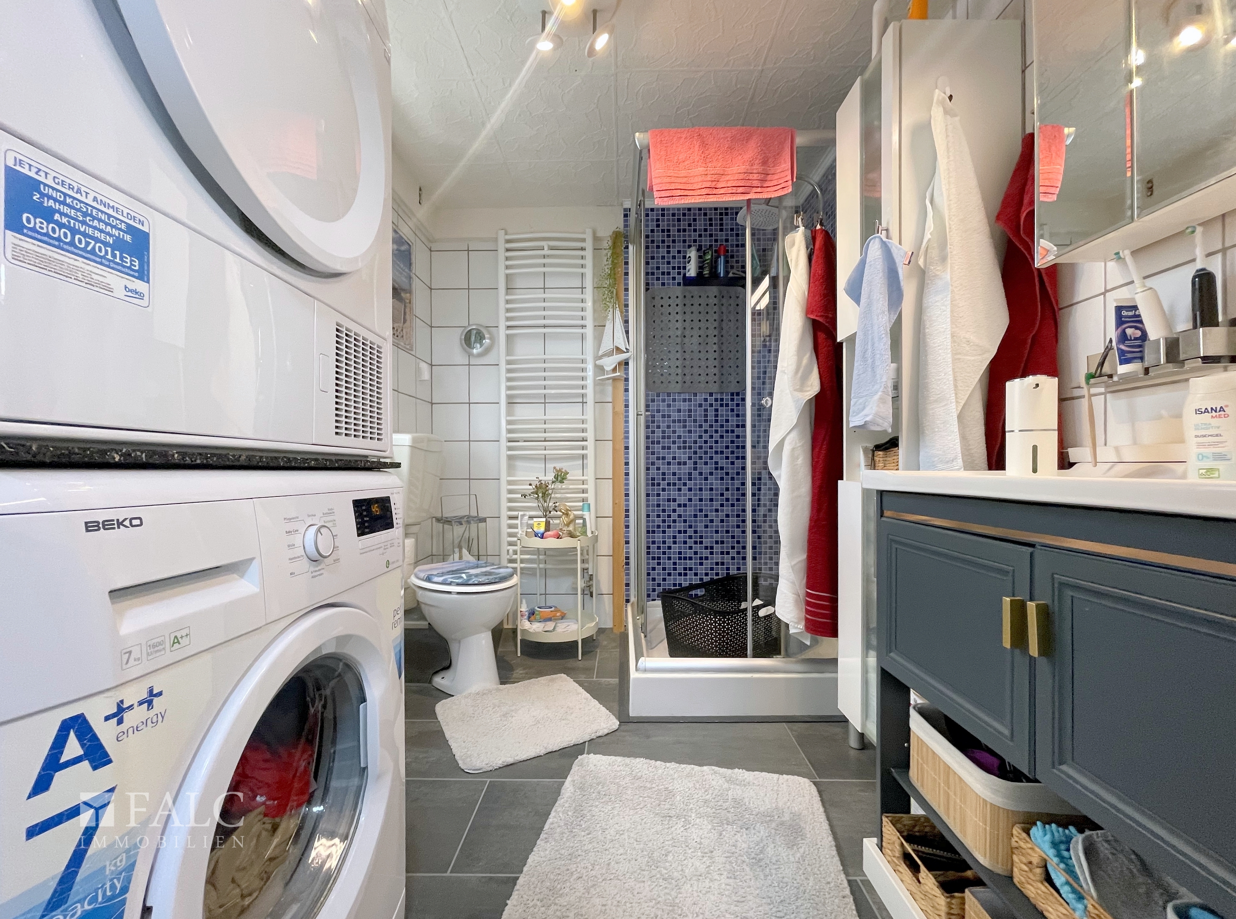 Die Fenster sind in pflegeleichten Kunststoffrahmen eingefasst und mit Rollläden ausgestattet, was für zusätzlichen Sicht- und Wärmeschutz sorgt. Der Boden ist überwiegend mit Laminat ausgelegt, was eine warme Wohnatmosphäre schafft und sich leicht reinigen lässt. Im Badezimmer wurden pflegeleichte Fliesen verlegt. Es ist mit einer Dusche, einem Fenster sowie einem Waschmaschinenanschluss ausgestattet und erfüllt damit sowohl praktische als auch komfortable Anforderungen.