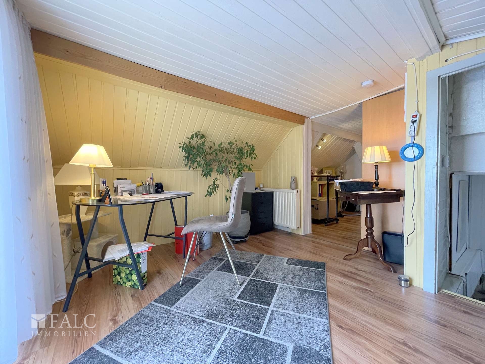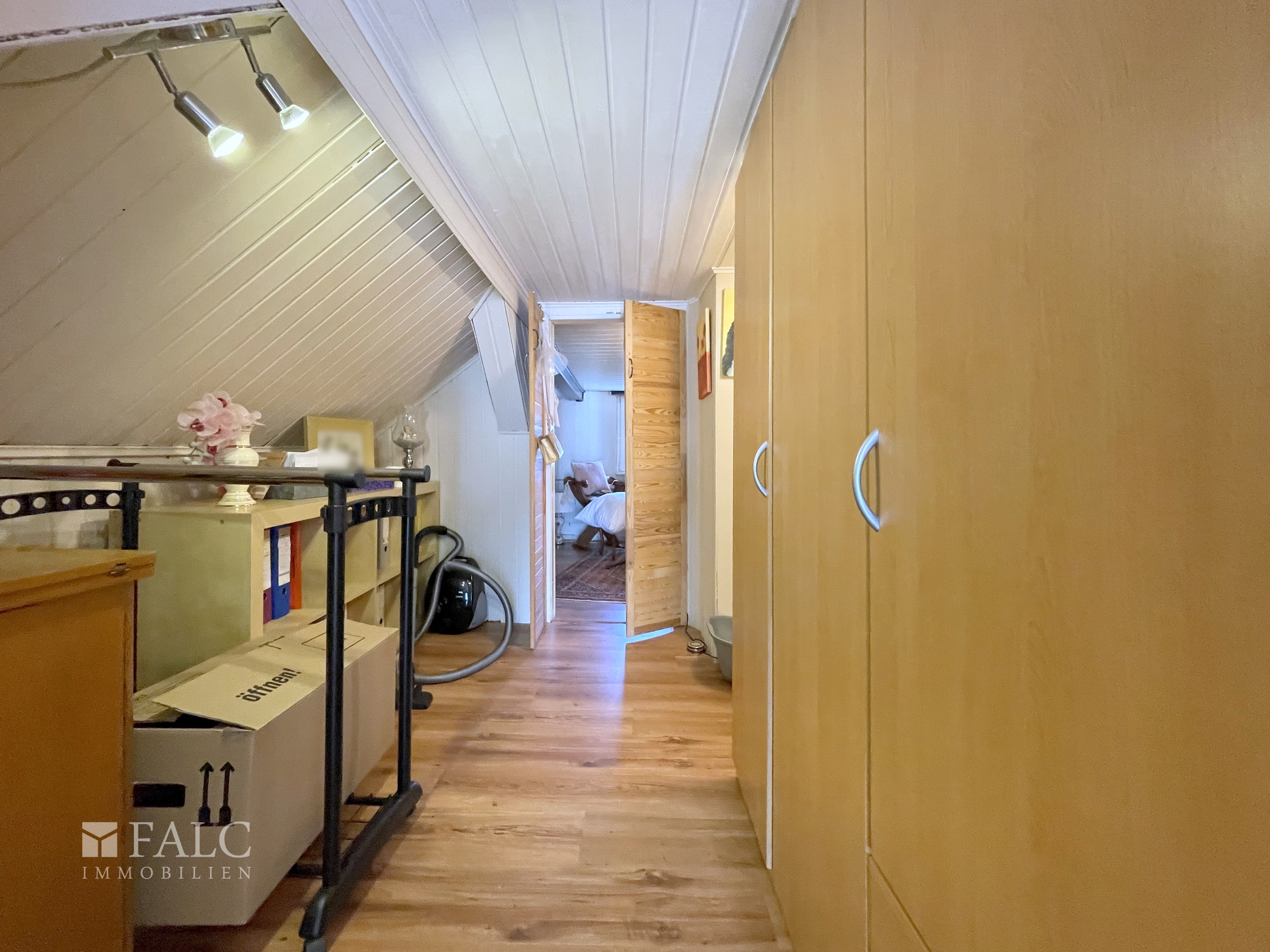 Auf der linken Seite liegt die Küche mit angrenzendem Essbereich – ein freundlicher, heller Platz, an dem man gemeinsam kocht, isst und ins Gespräch kommt. Durch die Nähe zum Essbereich lässt sich der Alltag hier besonders angenehm gestalten. Rechterhand lädt das gemütliche Wohnzimmer zum Entspannen ein, mit ausreichend Platz für eine großzügige Sitzgarnitur und persönlichen Wohnstil. Am Ende des Flurs befindet sich das Schlafzimmer, das sich als ruhiger Rückzugsort anbietet. Die Räume verfügen über eine eher niedrigere Deckenhöhe, was ihnen eine behagliche, gemütliche Atmosphäre verleiht. Eine Treppe führt ins ausgebaute Dachgeschoss, wo sich ein weiteres Schlafzimmer befindet.
