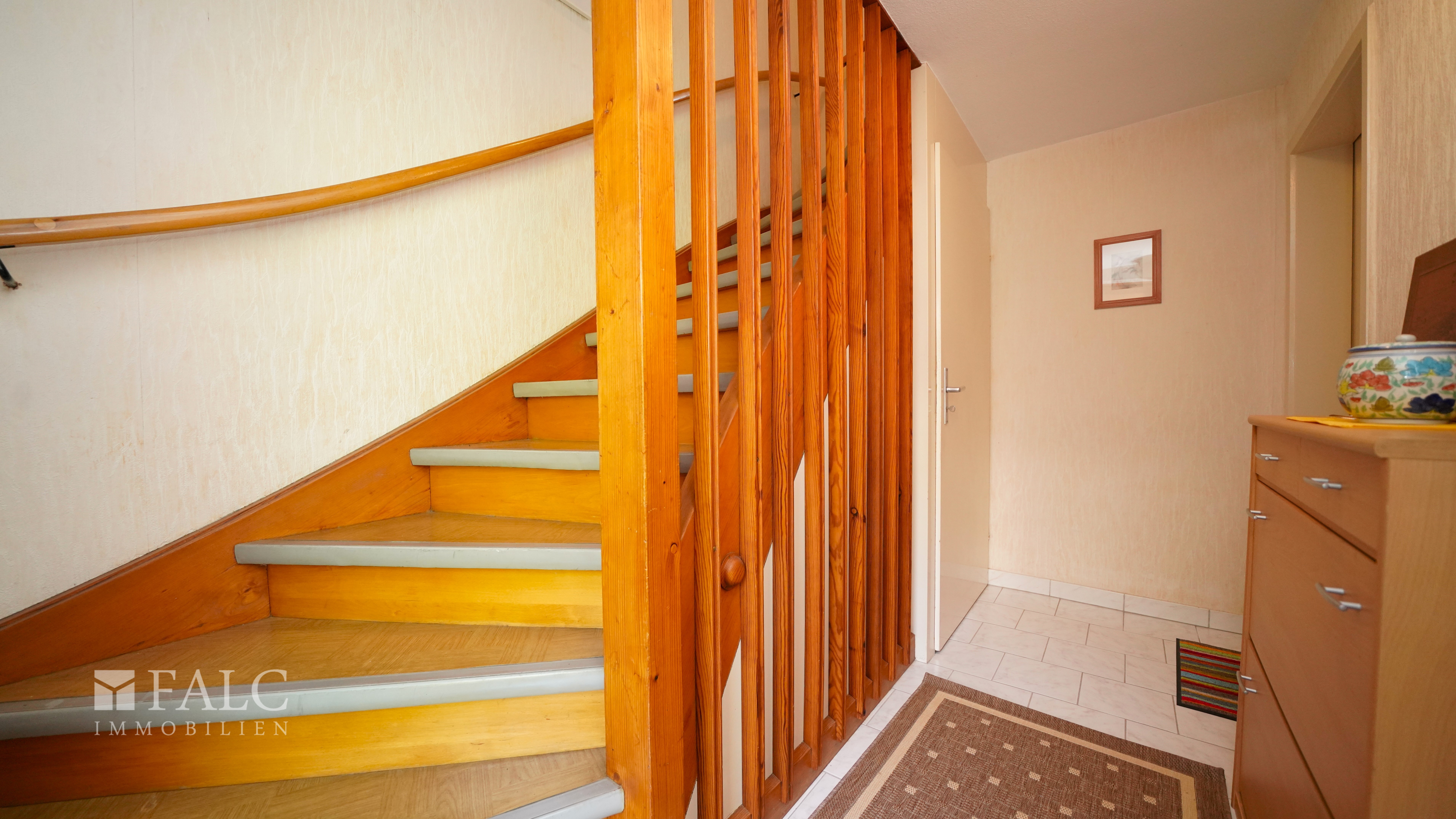 Auf der Rückseite des Hauses betreten Sie Ihr neues Zuhause durch einen einladenden Eingang, der Sie direkt in das helle und freundliche Treppenhaus führt. Bereits der erste Eindruck vermittelt ein Gefühl von Ruhe und Geborgenheit.