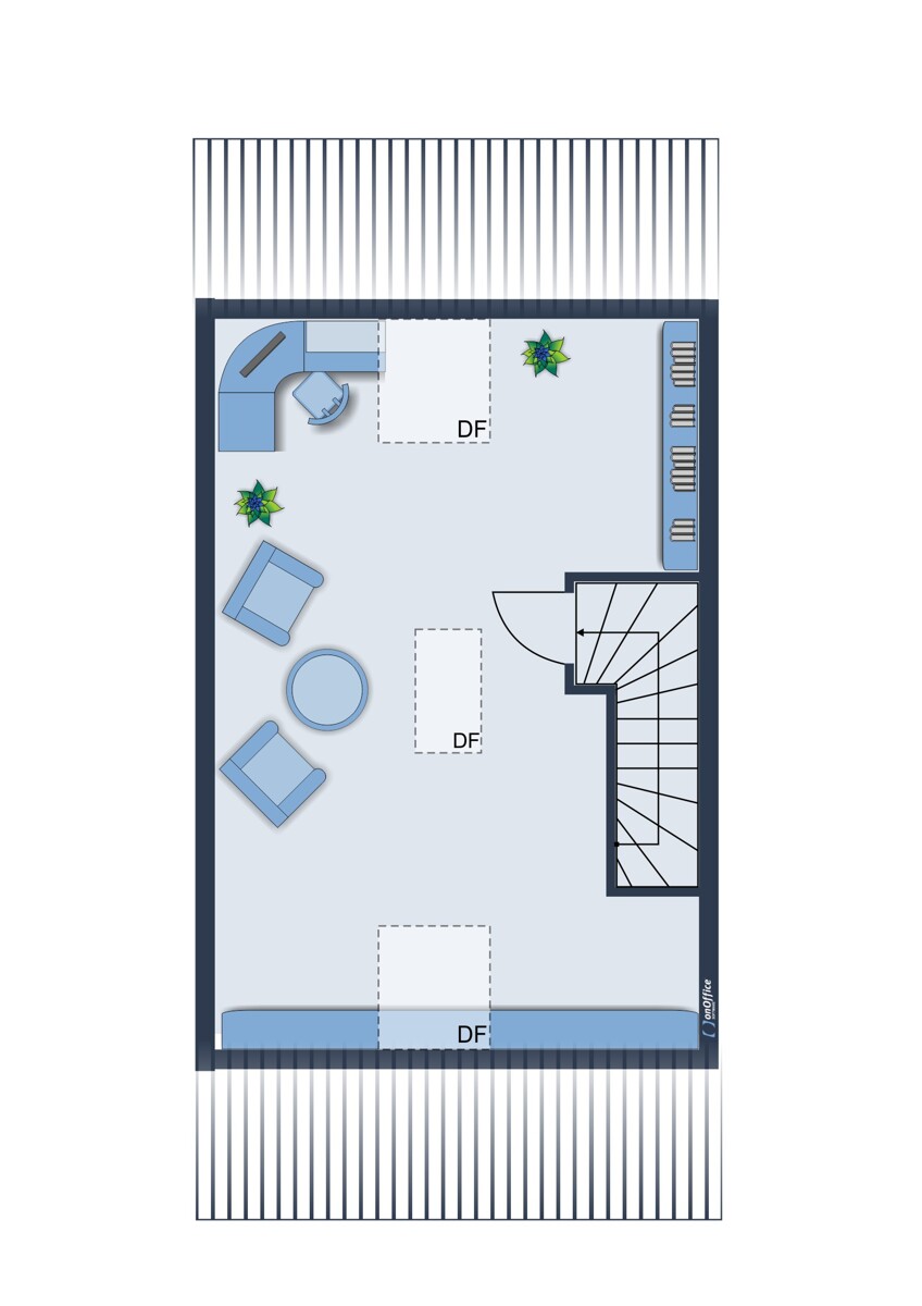 Das Haus verfügt über einen gut durchdachten Grundriss mit insgesamt einem Wohnzimmer, einem Schlafzimmer, zwei Kinderzimmern und einem Studio. Zwei der Wohnetagen sind als Vollgeschosse konzipiert. Von daher gibt es in diesen Bereichen keine Einschränkungen aufgrund von Dachschrägen. Auch Familien mit bis zu drei Kindern finden hier ausreichend Platz, um sich wohlzufühlen.