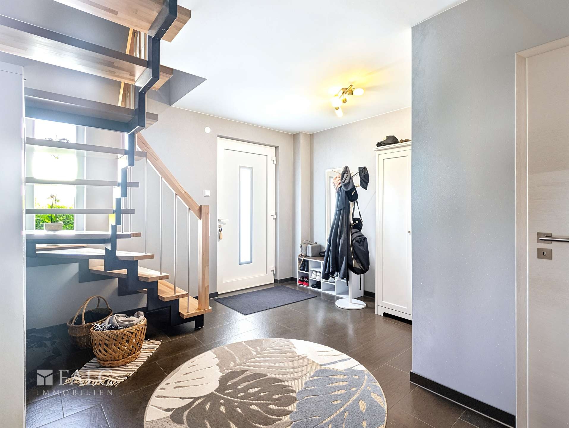 Beim Betreten dieses modernen Hauses aus dem Jahr 2015 erwartet Sie ein einladender Eingangsbereich, der direkt in den großzügigen Wohn- und Essbereich führt. Die offene Gestaltung bietet viel Raum für geselliges Beisammensein und ist ideal für Familien. Große Fensterfronten bieten einen herrlichen Blick auf den gepflegten Garten.