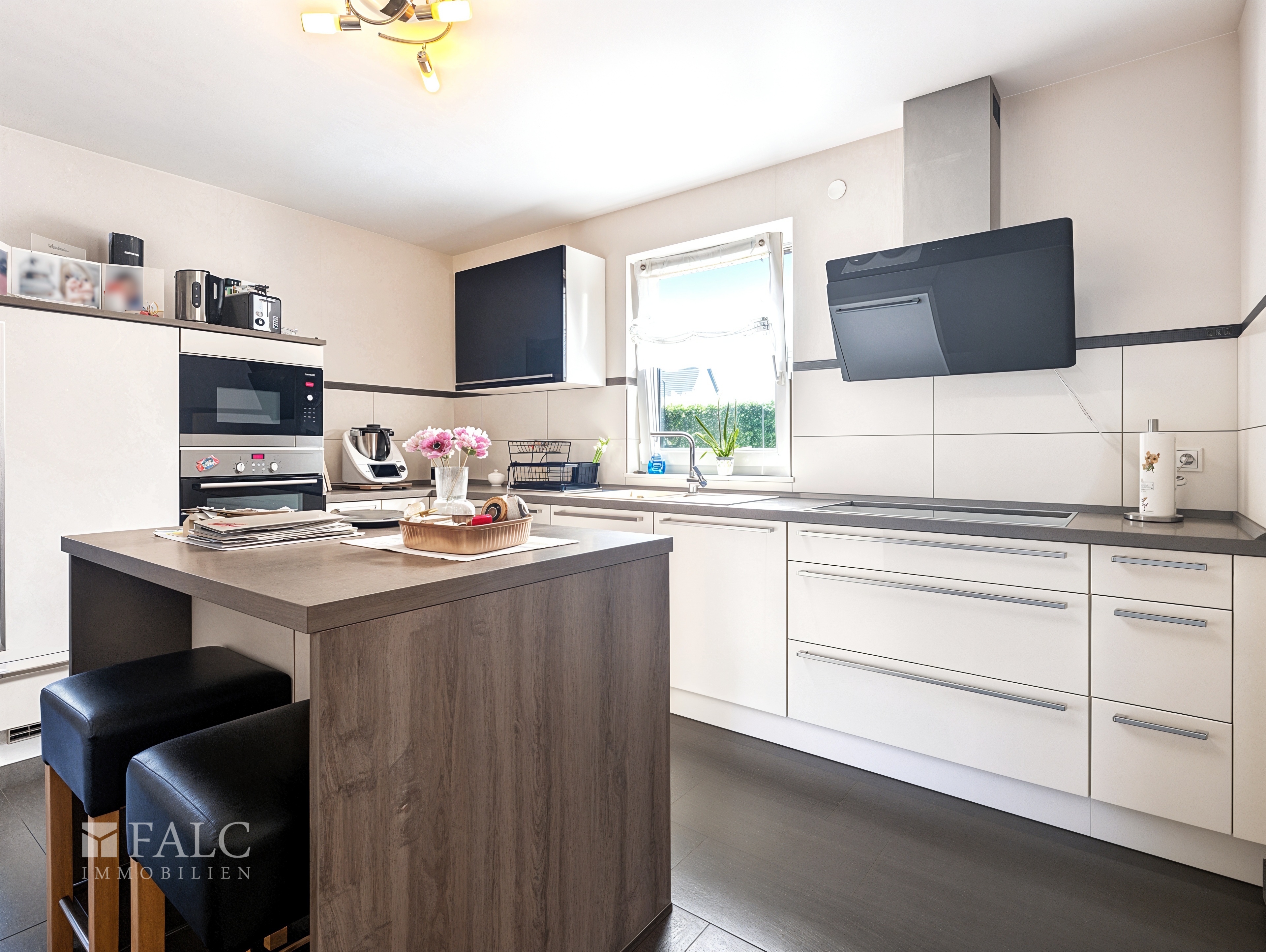 Die Küche ist modern ausgestattet und bietet viel Stauraum sowie eine praktische Kochinsel, die zum gemeinsamen Kochen einlädt. Angrenzend an den Flur befindet sich das Gäste-WC, das für zusätzlichen Komfort sorgt.