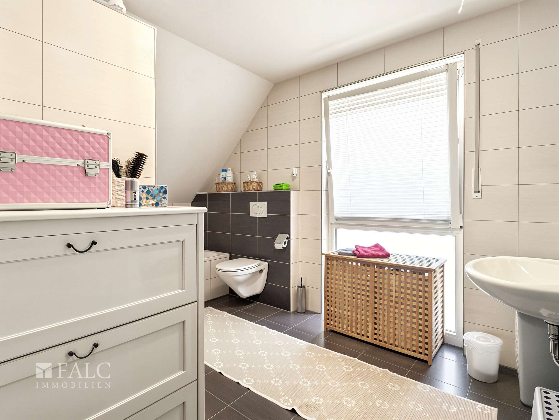 Das Badezimmer im Obergeschoss ist mit einer Badewanne und einer separaten bodentiefen Dusche ausgestattet und bietet genügend Platz für die ganze Familie.