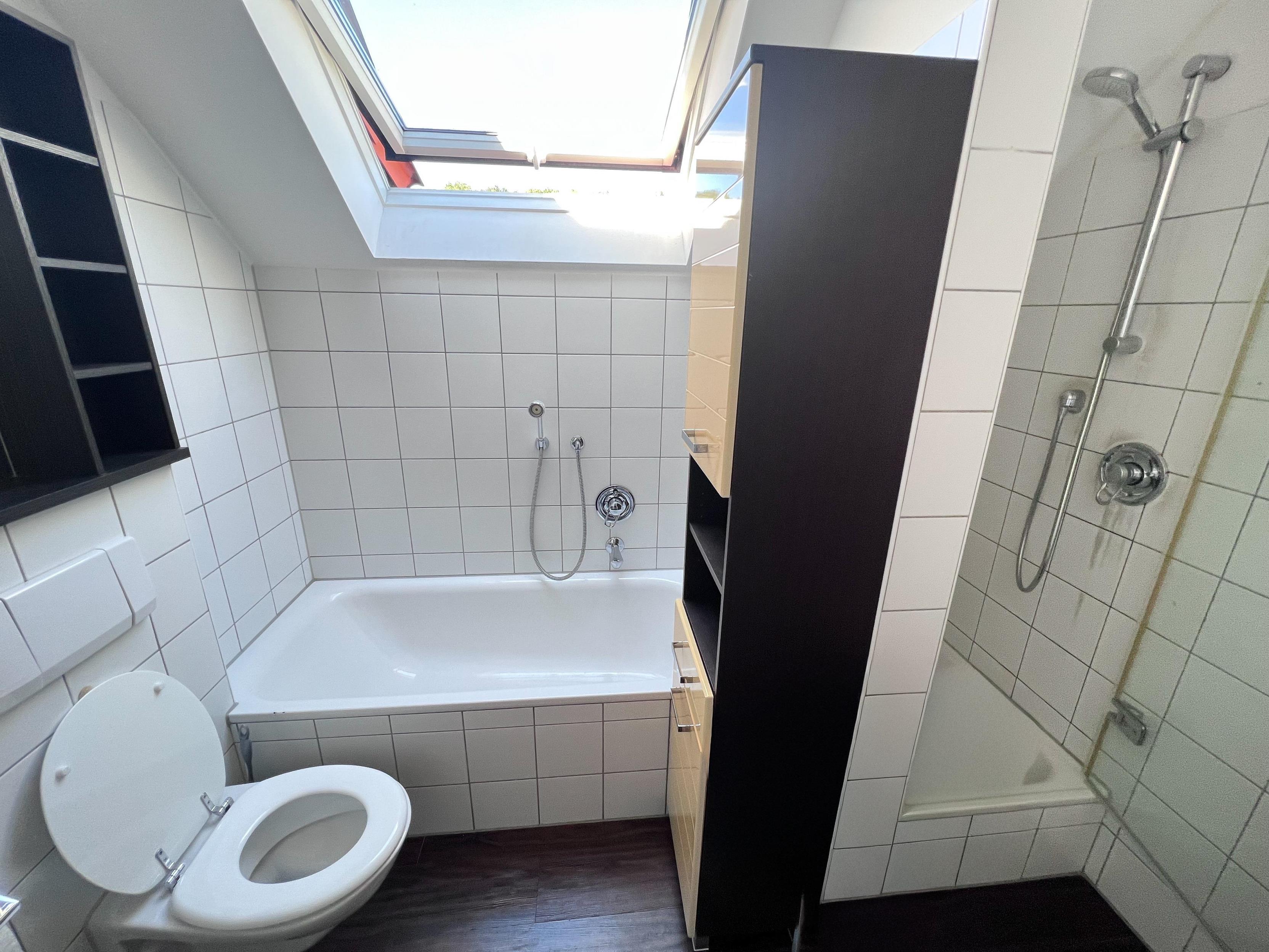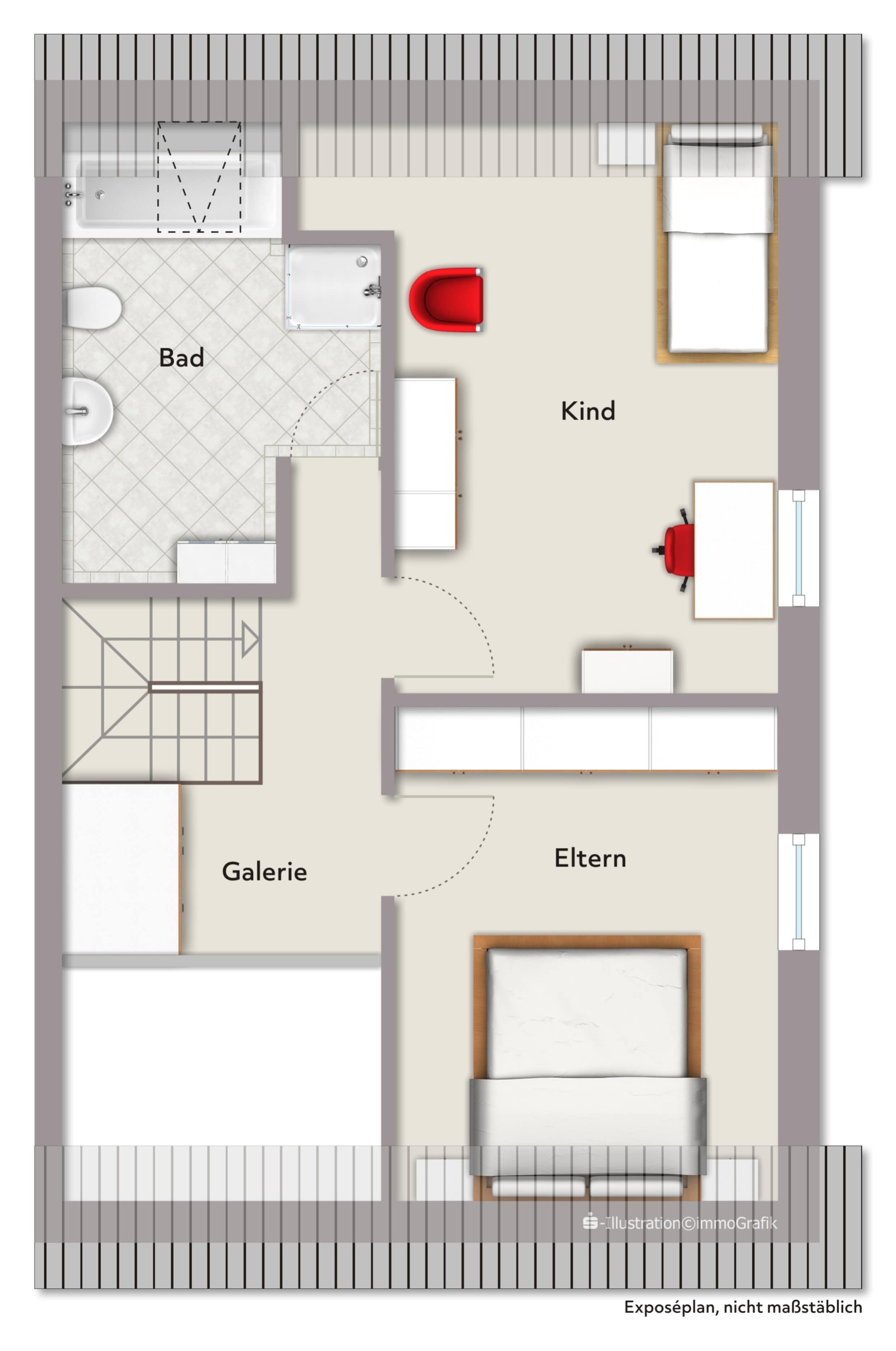 Über eine hochwertige Innentreppe erreichen Sie das Dachgeschoss – den privaten Rückzugsbereich der Wohnung. Besonders hervorzuheben ist die offene Galerie, die dem Wohnkonzept Großzügigkeit und eine repräsentative Note verleiht. Zwei Schlafzimmer sowie ein Badezimmer mit Badewanne und Dusche runden diese Ebene harmonisch ab.