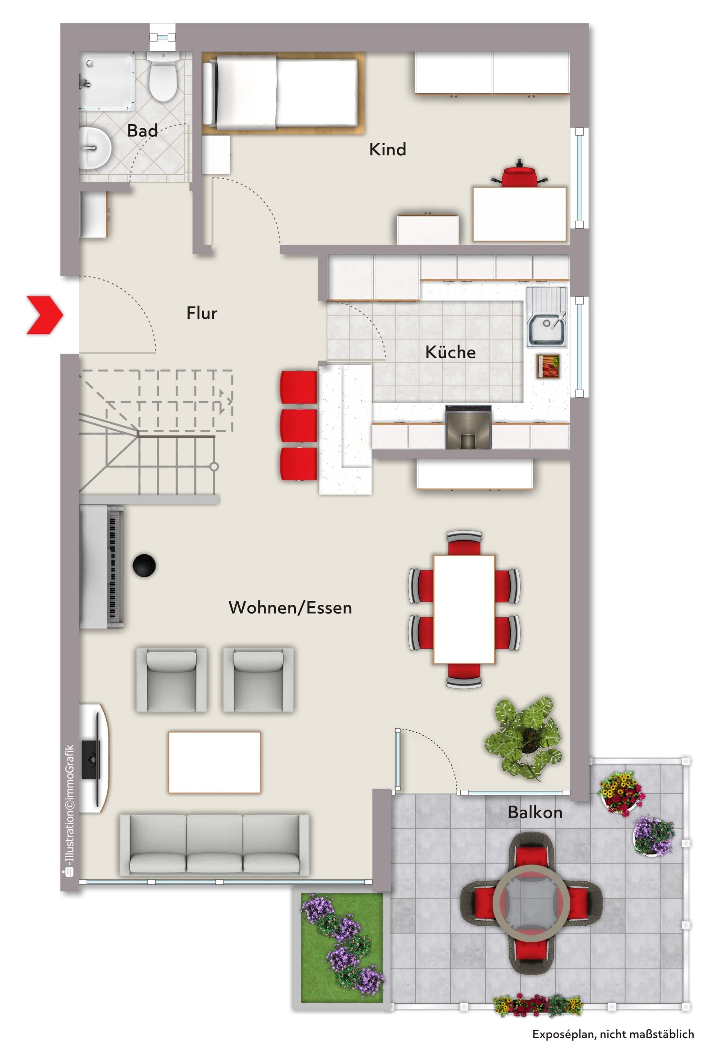 Im Obergeschoss empfängt Sie ein gut geschnittener Flur, von dem aus alle Räume bequem erreichbar sind. Hier befinden sich ein Gäste-WC, ein flexibel nutzbares Zimmer, das sowohl als Kinderzimmer, Arbeits- oder Gästezimmer gestaltet werden kann, sowie die offene Küche. Der großzügige Wohn- und Essbereich ist das Herzstück der Wohnung: lichtdurchflutet, einladend und mit direktem Zugang auf den sonnigen Balkon, der zum Verweilen im Freien einlädt.