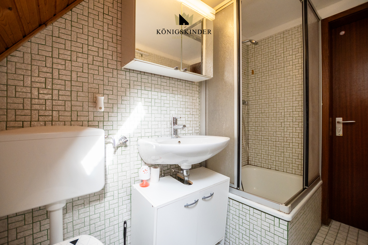 Tageslichtbad mit Dusche, Waschbecken, WC Laminatboden Einbauküche 4 Zimmer Fenster 2-fach verglast aus Holz
