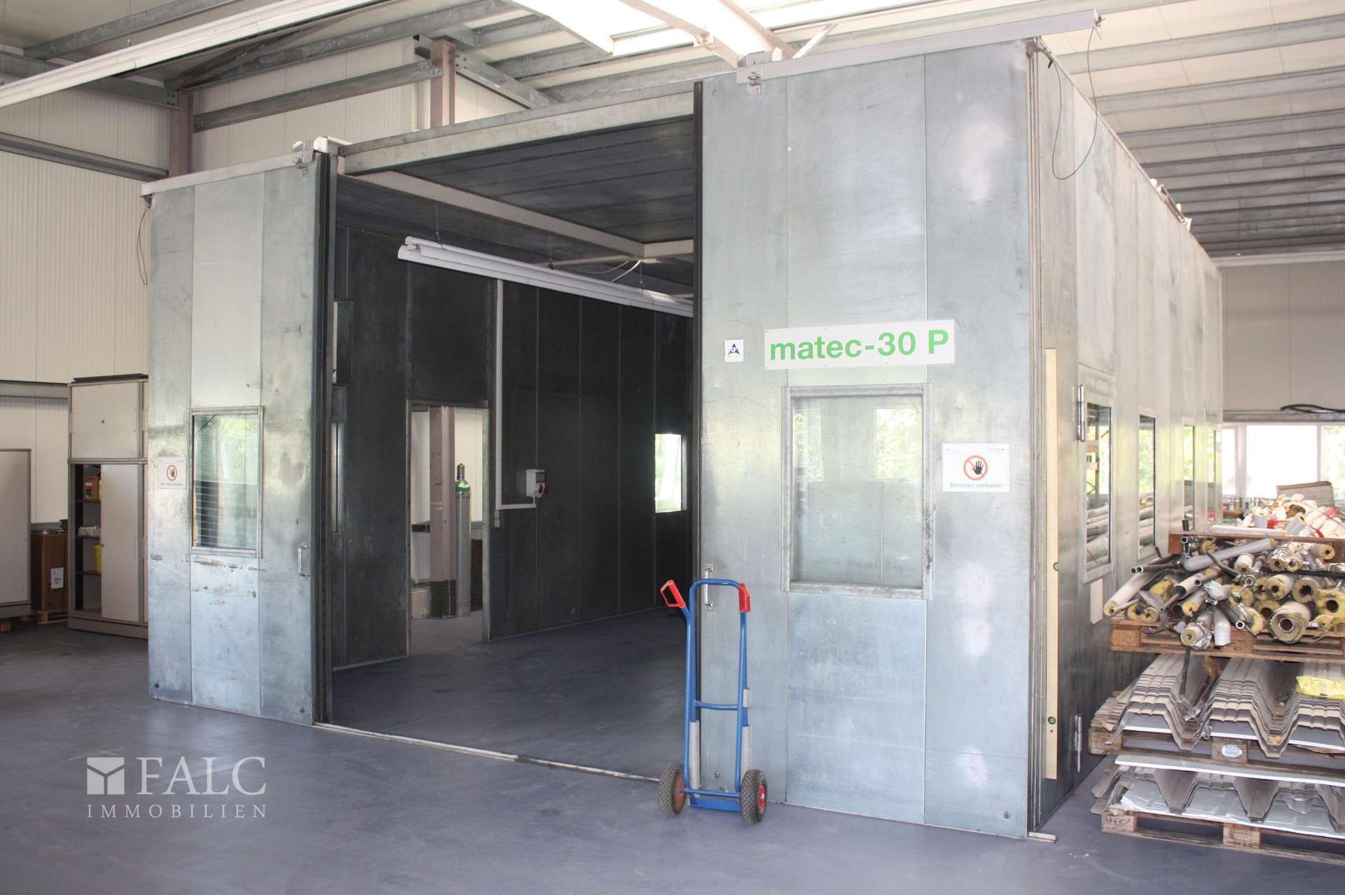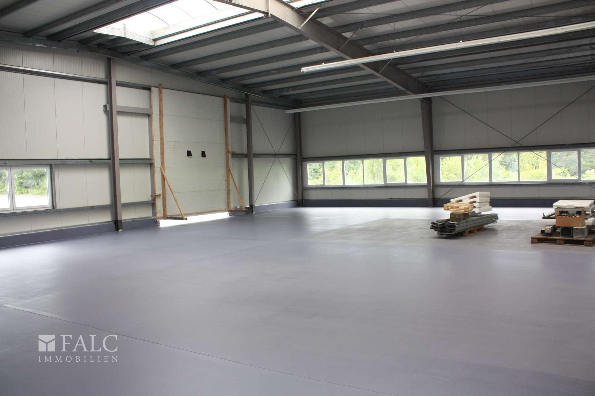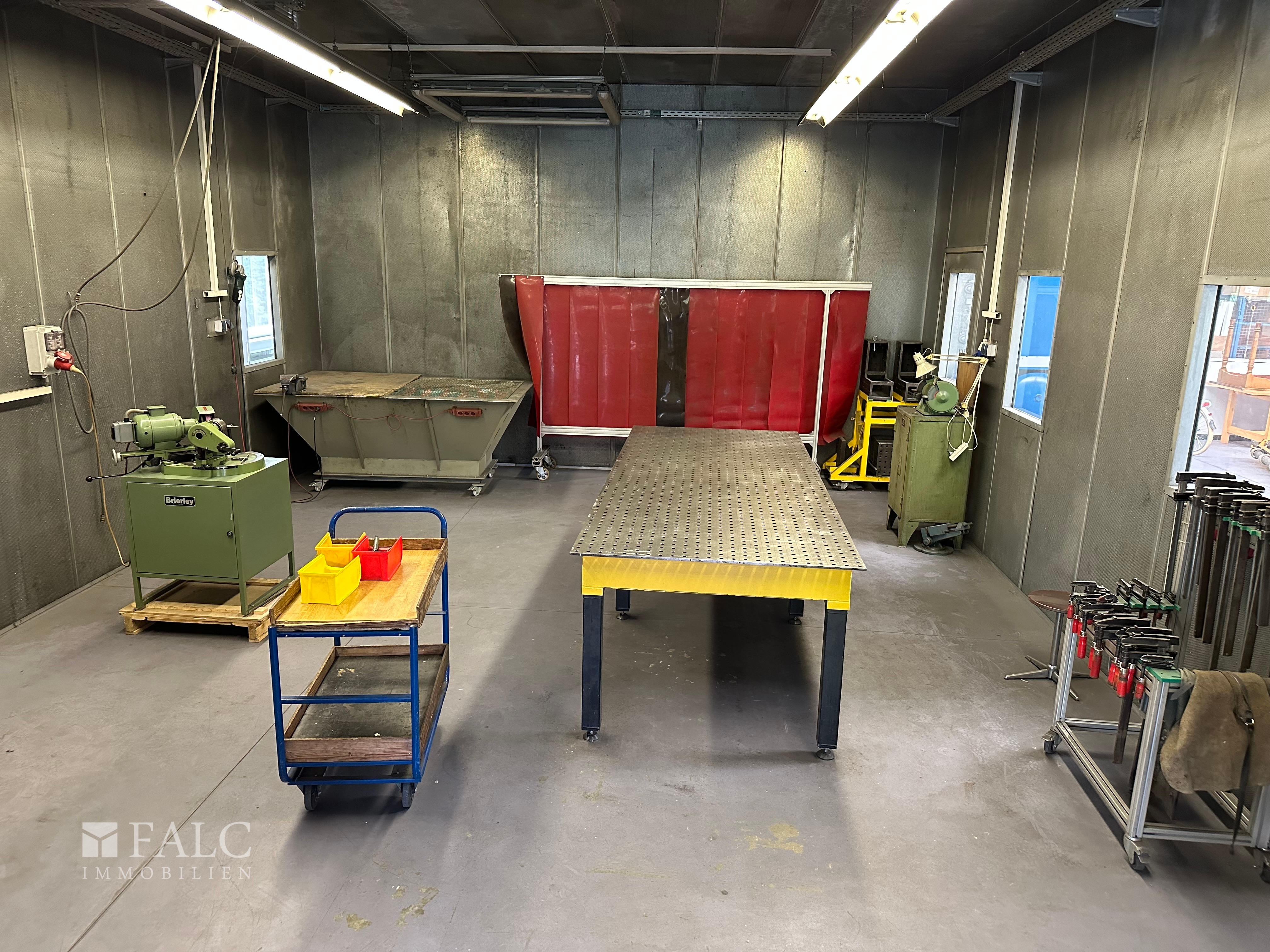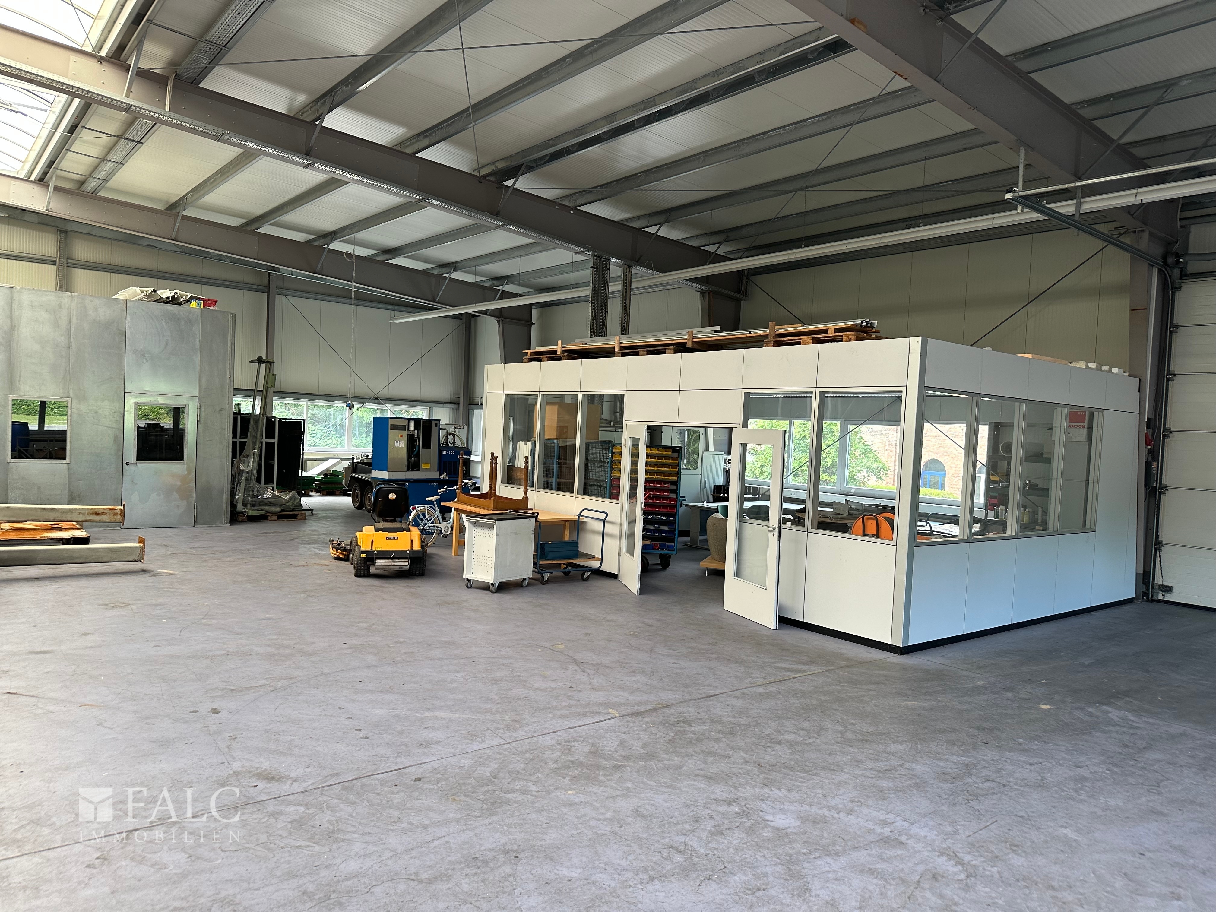 Im Inneren der beheizbaren Halle finden sich helle, offene Flächen, die durch große Fensterfronten viel Tageslicht bieten. Ein integrierter Schweißraum ermöglicht spezialisierte Arbeiten direkt vor Ort. Die Büroflächen sind funktional gestaltet und bieten Raum für administrative Tätigkeiten.