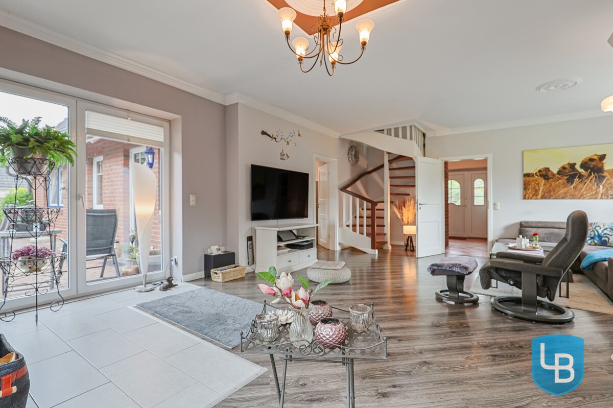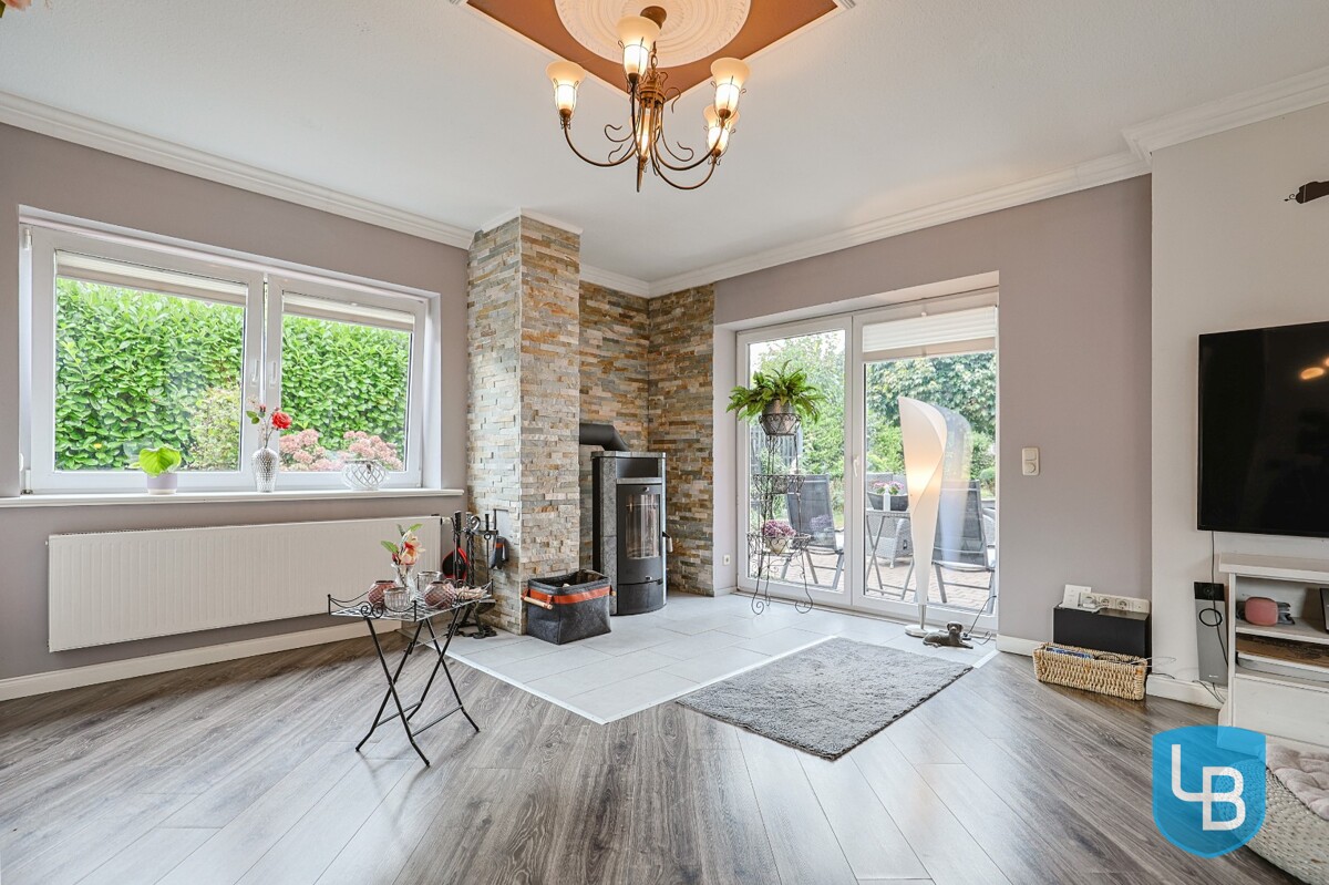 + Eingangsbereich mit Platz für eine Garderobe + Großes Wohnzimmer mit Kamin und Zugang zur Terrasse + Voll ausgestattete, moderne Küche mit Sitzmöglichkeiten und Zugang zur Terrasse + Duschbad und Fenster + Wannenbad mit Fenster + HWR mit Waschmaschinenanschluss, Gas-Heizung und Außenzugang + Drei Individuell nutzbare Räume (Kinder/Gäste/Schlafzimmer/Ankleidezimmer) + Weiterer Flur
