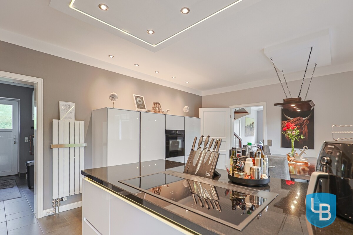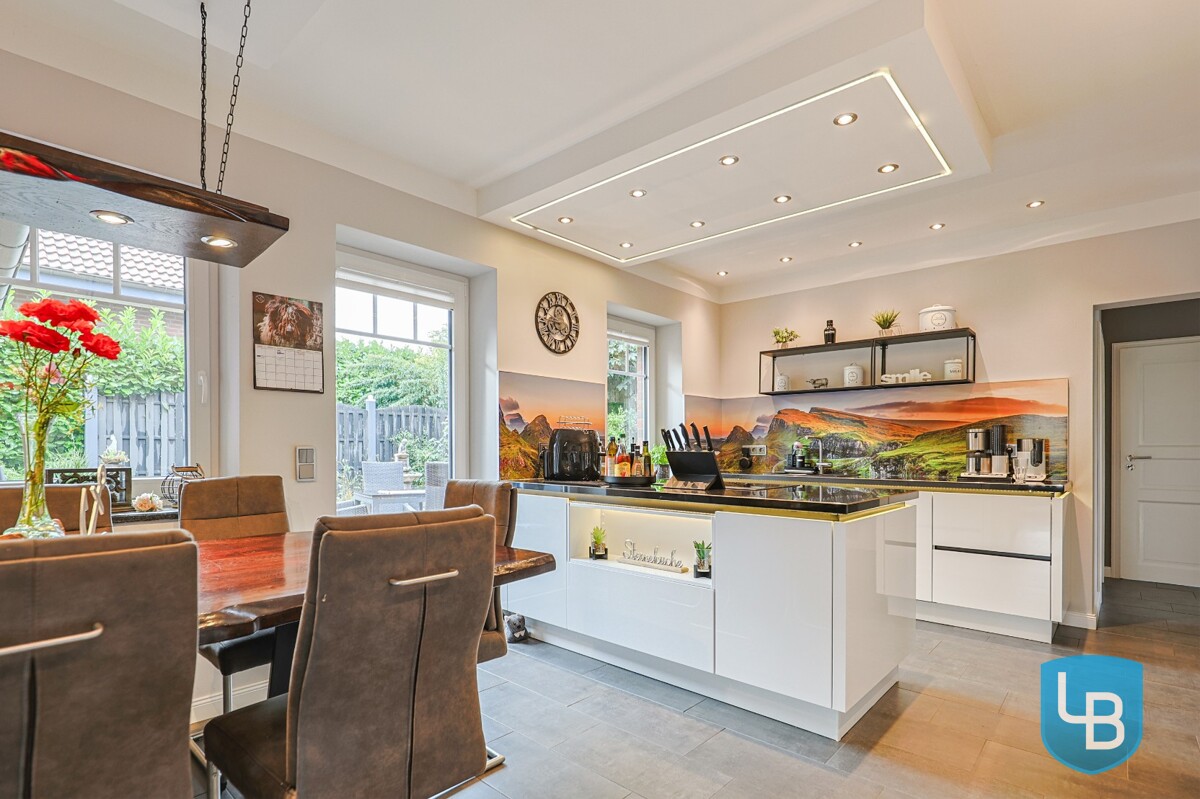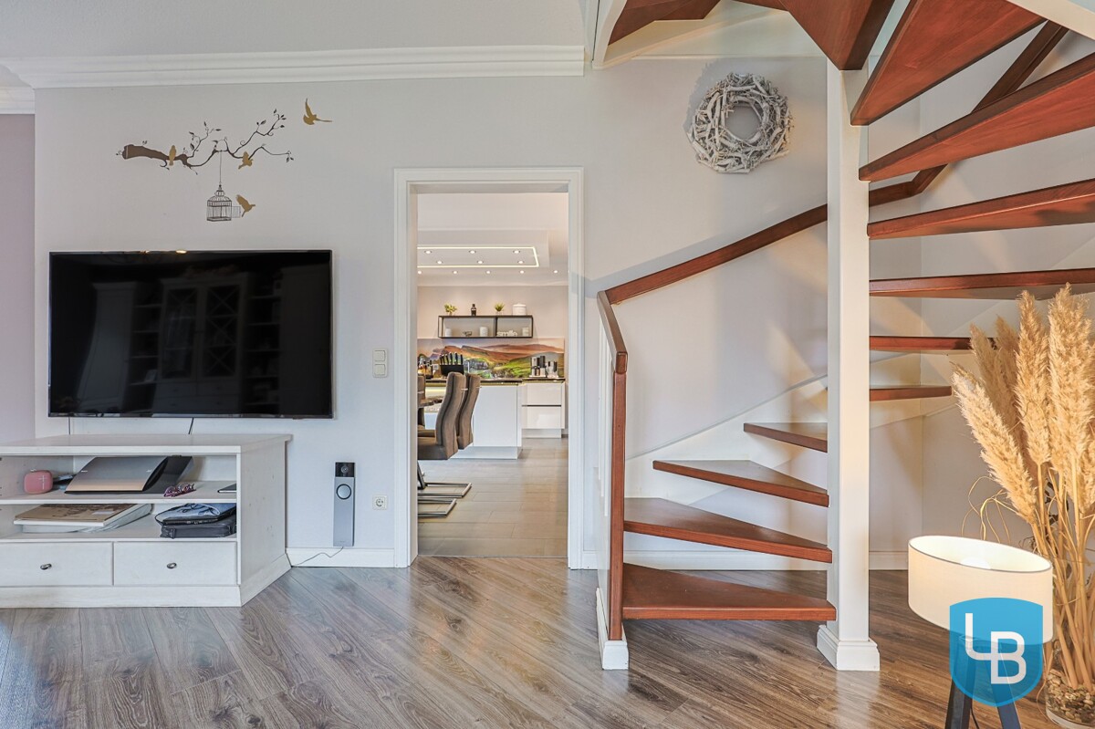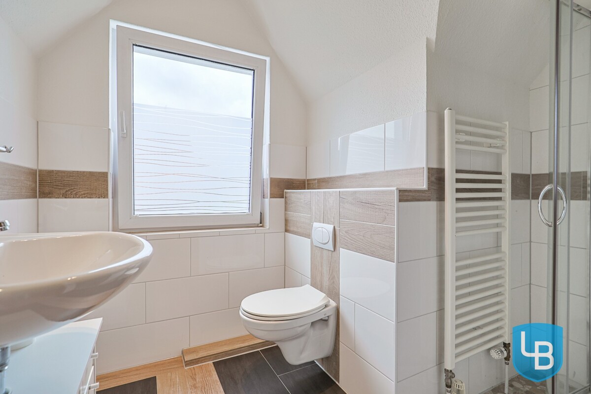 Im Inneren des Hauses erwartet Sie ein hochwertiges Wohnambiente: Ein stilvoller Kamin im Wohnzimmer sorgt für wohlige Wärme, die offene Holztreppe verbindet die Etagen auf charmante Weise. Die moderne, voll ausgestattete Küche ermöglicht zusätzlich ausreichend Platz für einen großen Esstisch und geht fließend in den Wohnbereich über. Zwei Bäder, drei flexibel nutzbare Wohnräume sowie ein Hauswirtschaftsraum mit Waschmaschinenanschluss und separatem Außenzugang runden das Angebot im Erdgeschoss ab. Im Dachgeschoss stehen Ihnen vier weitere Räume zur Verfügung (ein Raum wird nicht zur Wohnfläche gezählt) sowie ein modernes Duschbad – ideal für größere Familien oder für die Kombination aus Wohnen und Arbeiten. Die großzügige Terrasse ist sowohl vom Wohnzimmer als auch vom Esszimmer aus zugänglich und führt sowohl in den pflegeleicht angelegten Garten als auch in den Vorgarten.