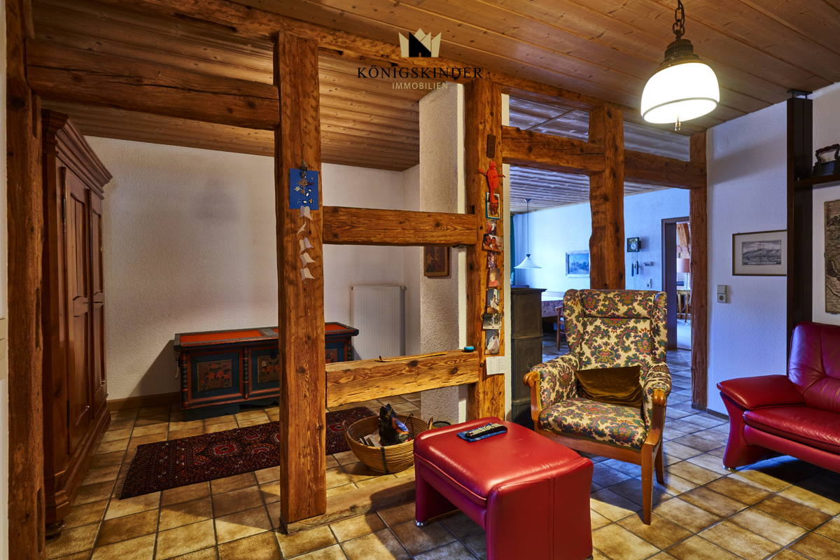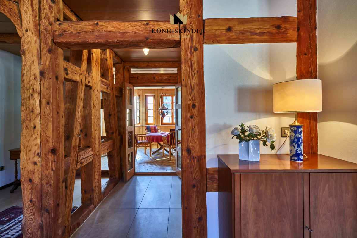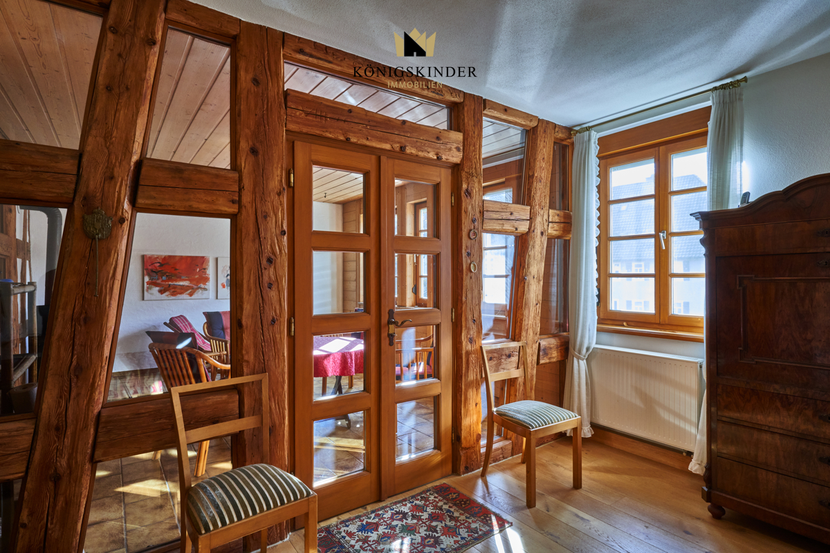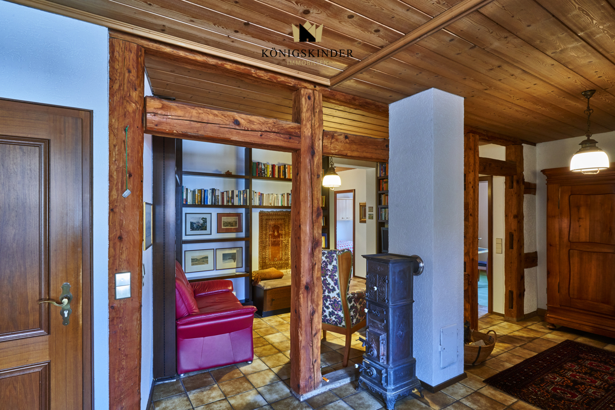 Die tragenden Balken wurden freigelegt und prägen die Wohnatmosphäre, die man als elegant-rustikal bezeichnen kann. Dadurch gewonnene Einblicke und Durchblicke verschaffen der Wohnung eine eigene Kultiviertheit.