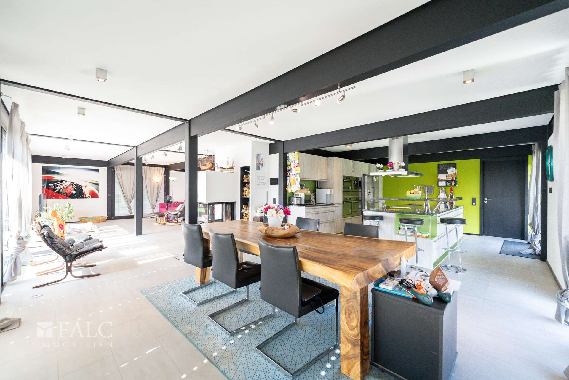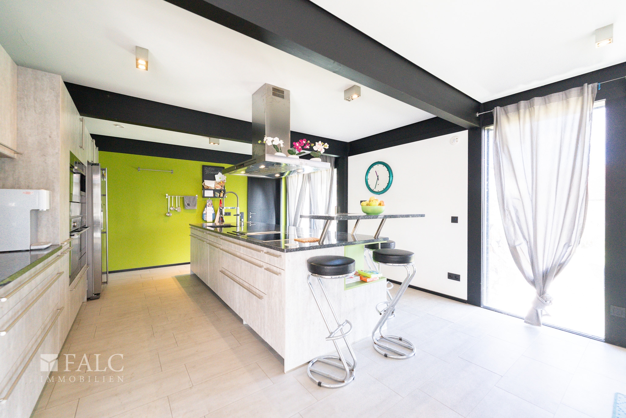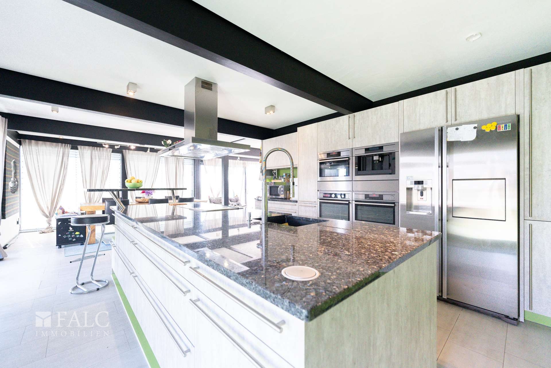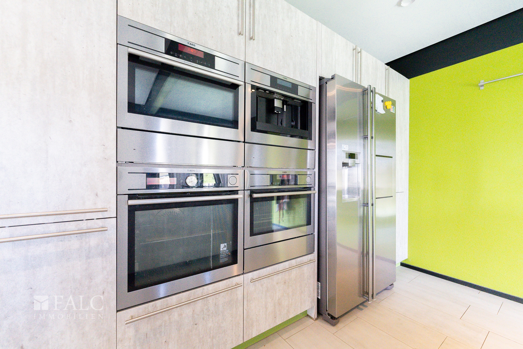 Wohn- und Nutzfläche Auf ca. 332 m² Wohnfläche plus 158 m² Nutzfläche verteilen sich drei Etagen, die bequem über eine Innentreppe erschlossen sind. Das Haus befindet sich in sehr gutem Zustand und überzeugt mit hochwertiger Ausstattung inklusive moderner Smart-Home-Technik (Anschaffungskosten über 100.000 €). Ein Aufzug ist vorhanden.