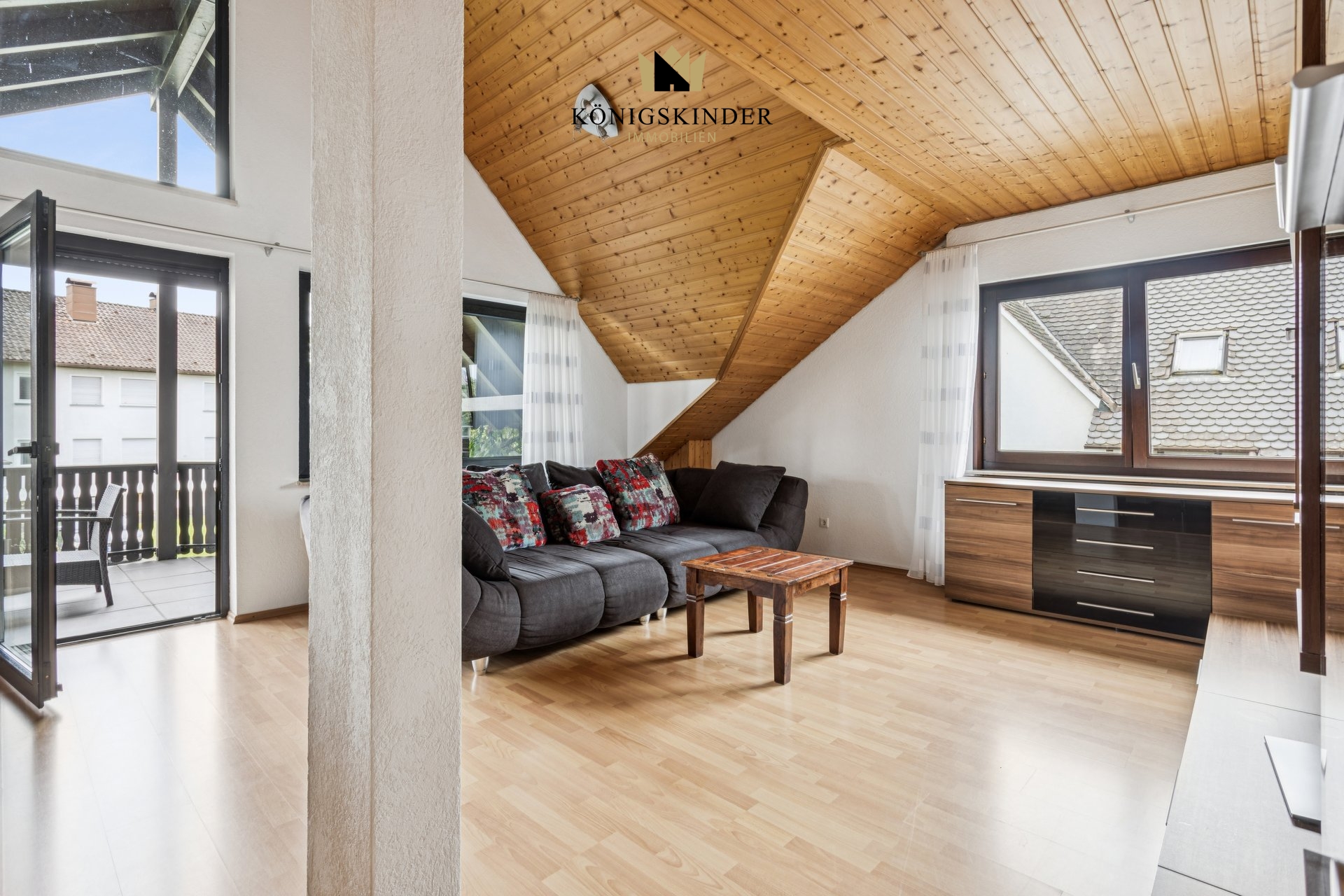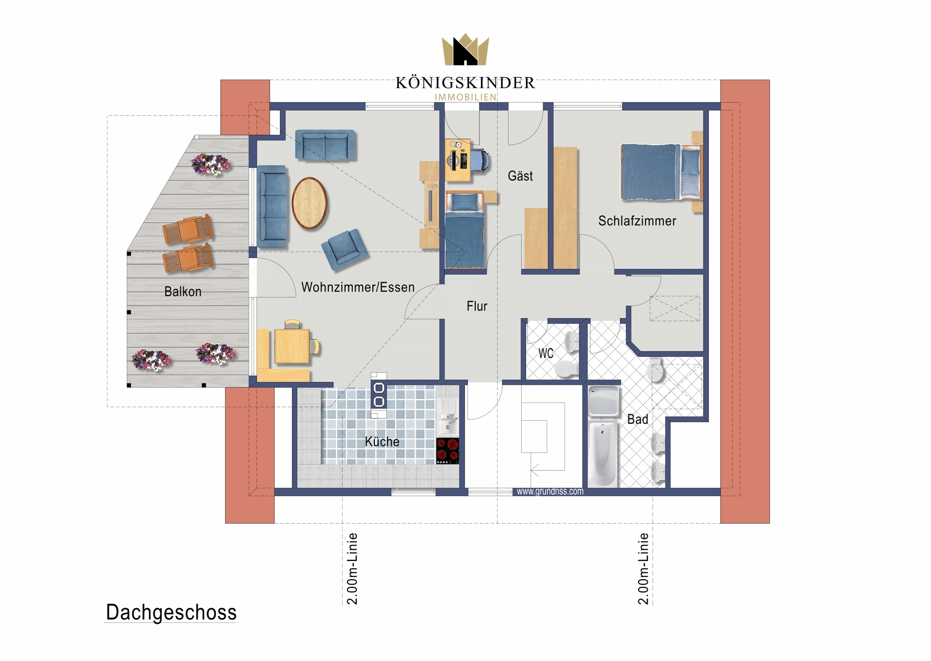Im Dachgeschoss befindet sich die große Ferienwohnung mit großem überdachten Balkon, Wohn/Essbereich, Küche, Bad, Gäste-WC, Abstellraum sowie 2 Schlafzimmer.