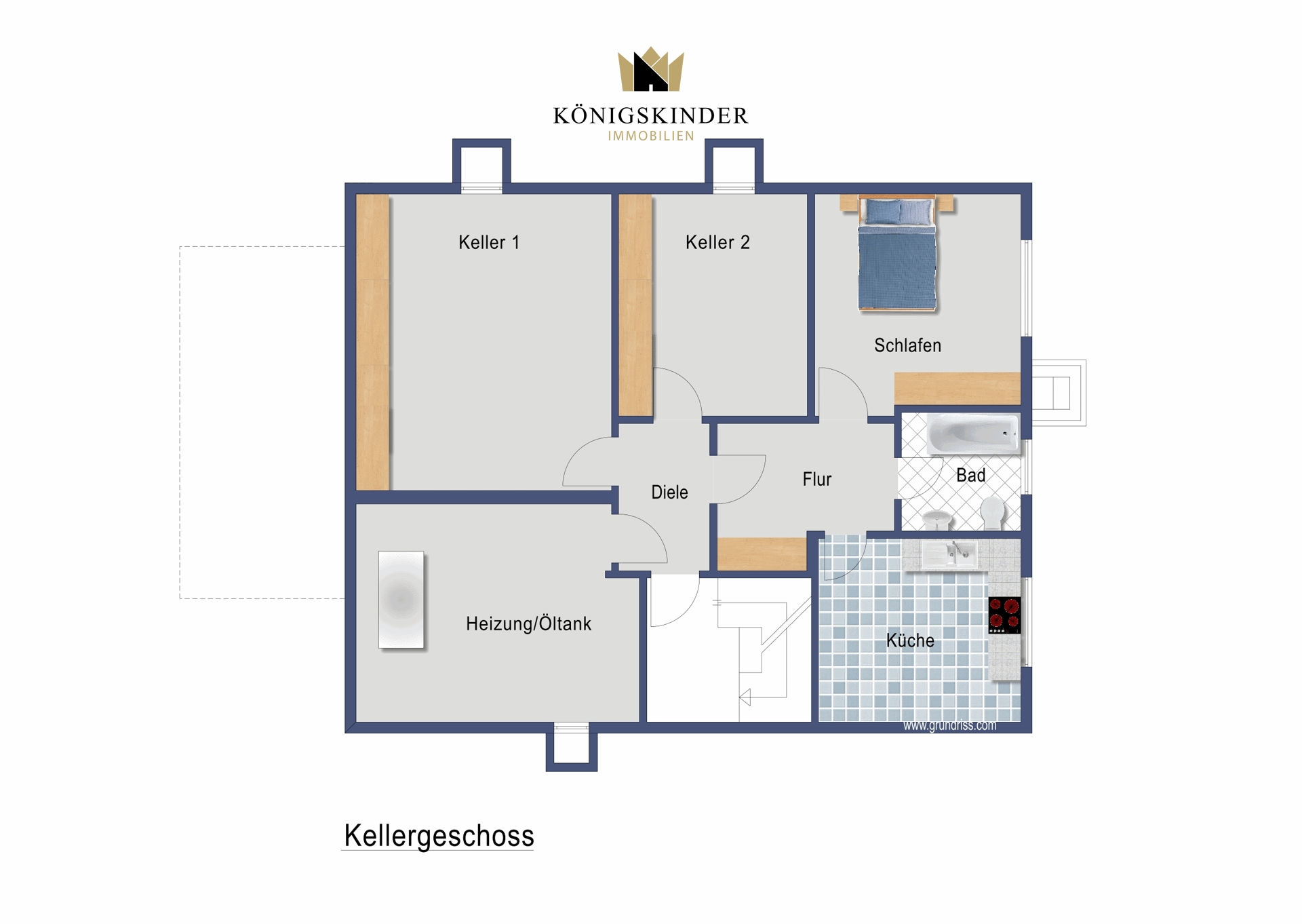 Im Untergeschoss gelangt man zur weiteren Ferienwohnung mit Wohnküche, Bad und einem Schlafzimmer sowie Keller und Technikräume.
