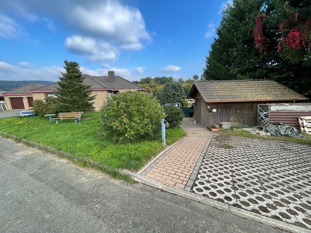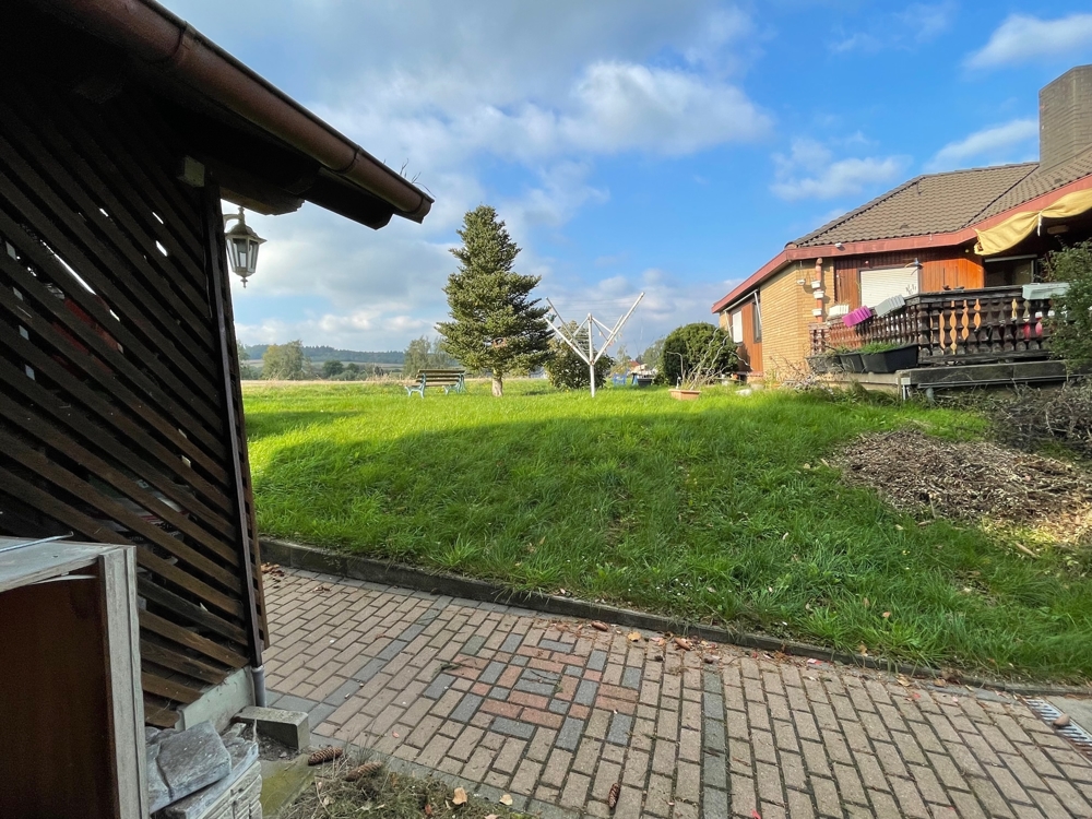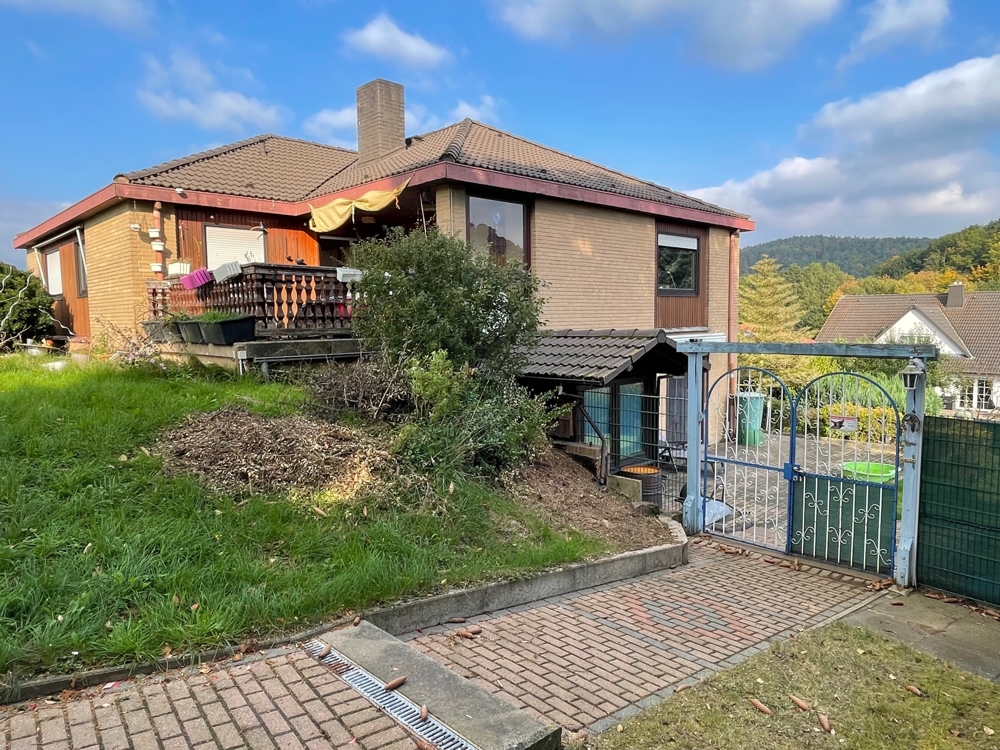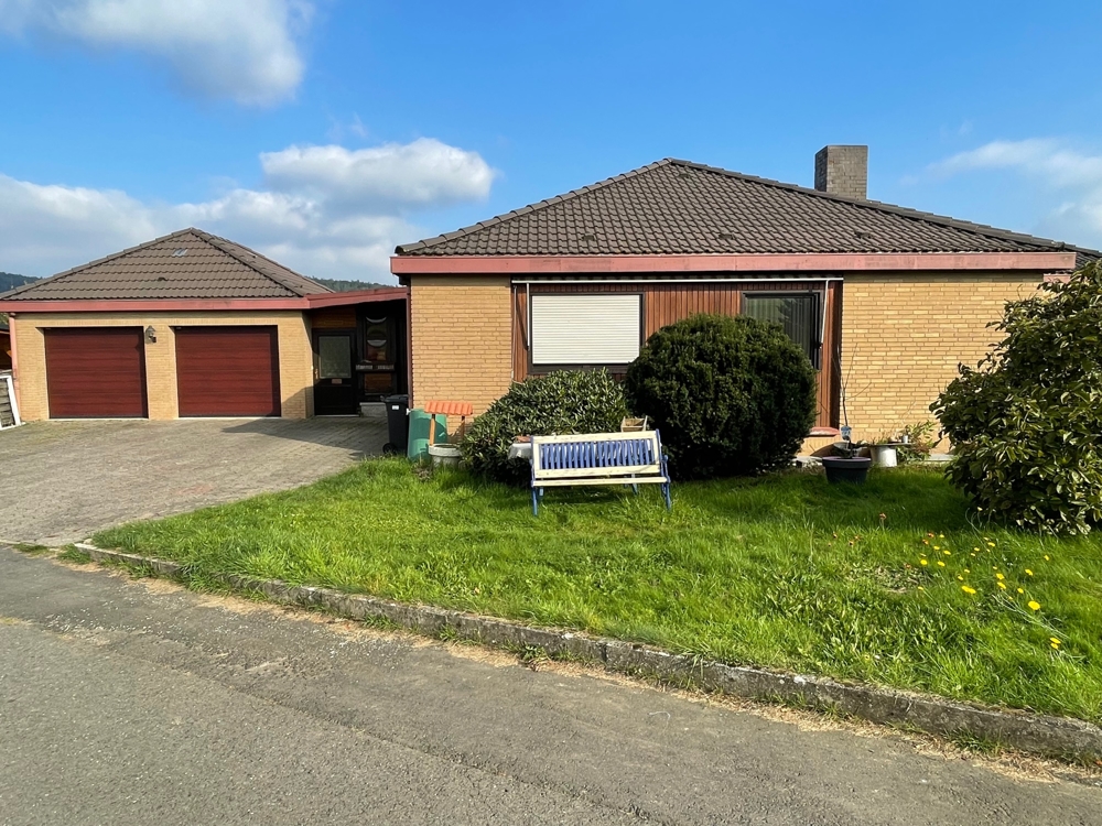 Der moderne Bungalow mit Einliegerwohnung nebst großem Grundstück am Ortsrand mit Klinkerfassade und Walmdach wurde in 1984 massiv errichtet und mehrfach modernisiert: in 2000 + 2006 und 2012 bis 2014. Hierzu zählen folgende Investitionen: Kunststofffenster im Untergeschoss, das Dach, Bad im UG, neue Bodenbeläge und Malerarbeiten; im UG neue Heizung (Elektro), zwei Kamine, zwei Garagen und zwei Holzschuppen. Die Wohnung im Erdgeschoss hat insgesamt ca. 130 m mit großem Wohnzimmer hat ca. 30 m², Essen/Diele mit ca. 25 m², nebst Küche, Bad, Flur, Eltern-/ zwei Kinderzimmer nebst Terrasse sind ². Die zweite Wohnung im Untergeschoss hat insgesamt ca. 92 m². mit Wohn- und Eßbereich (ca. 29 m²), Eltern, Gästezimmer, Küche, Bad und Flur. Beide Etagen sind vermietet. Wesentlicher Energieträger für die Heizung mit Kombination der Heizkosten ist Strom und Stückholz (siehe Energieausweis).