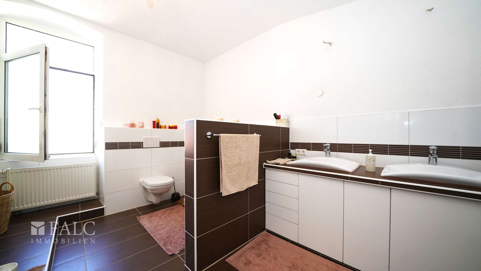 Auf der gegenüberliegenden Seite befindet sich das geschmackvoll ausgestattete Badezimmer. Eine bodengleiche Dusche, ein Doppelwaschbecken und moderne Materialien schaffen eine stilvolle und hochwertige Umgebung für Ihre tägliche Pflegeroutine.
